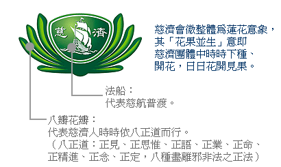 慈濟會徽 慈濟會歌 詞/曉雲法師 曲/李中和 慈濟發祥地 禮拜靜思堂 慈濟功德會 隊伍浩蕩長 慈濟功德會 隊伍浩蕩長 憫念貧苦病患 奔走長街陋巷 憫念貧苦病患 施醫施藥更施錢糧 我佛大醫王 慈雲被萬方 願慈濟因緣不息 普渡眾生上慈航 願慈濟因緣不息 普渡眾生上慈航