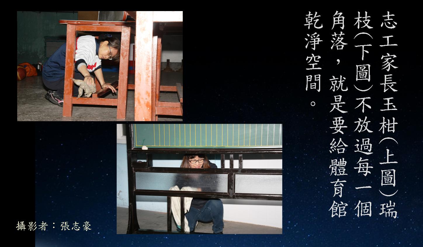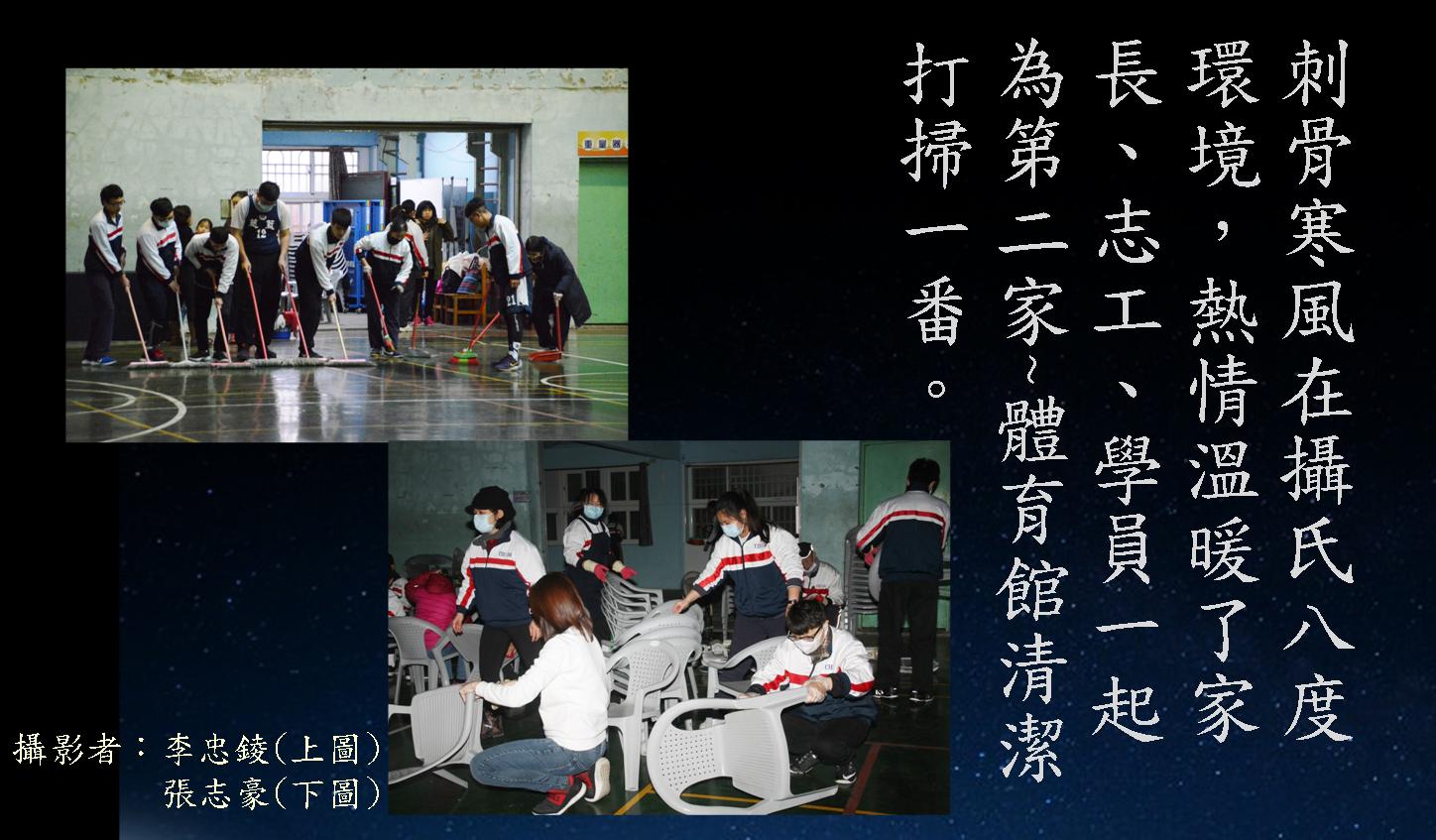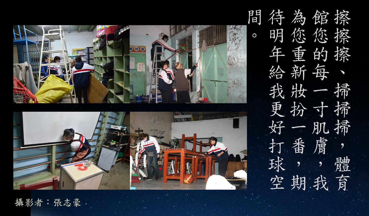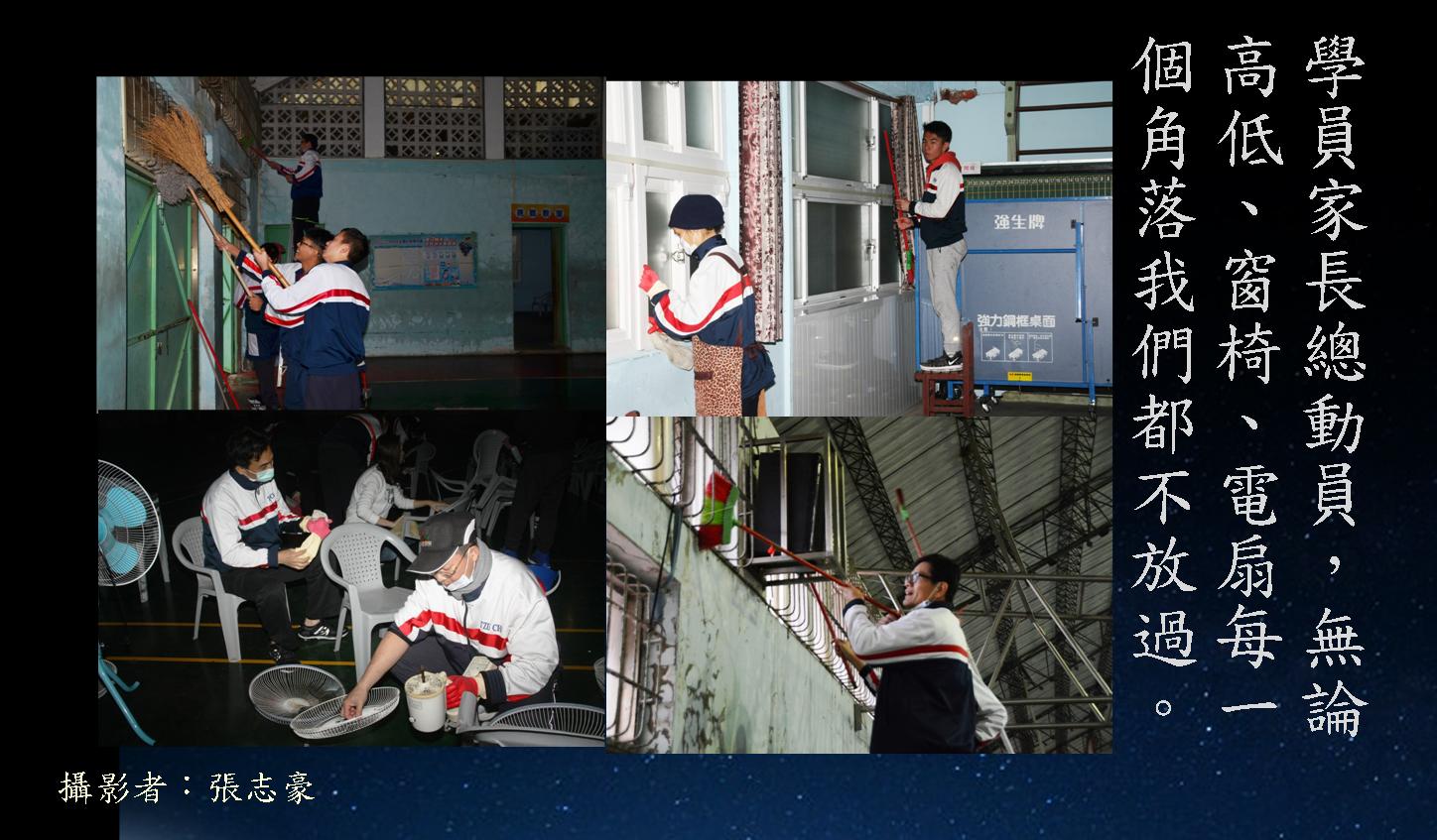 楊梅慈籃每逢歲末一定會為慈籃家族的第二個家~楊梅國中體育館,眾人齊心合力將體育館灑掃的煥然一新;但今年很不一樣除了常打球的學員及家長志工,更歡喜的是,今年還有在工作或就讀研究所和大學的學員一起加入打掃的行列,儘管天氣寒冷但他們說:在寒假能和家人一起打掃慈籃的第二個家是值得開心的一件事。