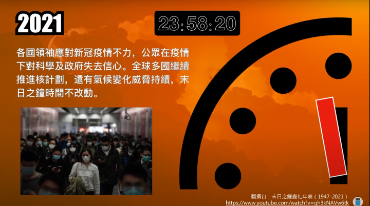 - 2021年,新冠疫情、核戰威脅、氣候變遷等因素,末日時鐘維持100秒。
