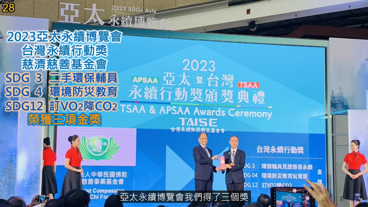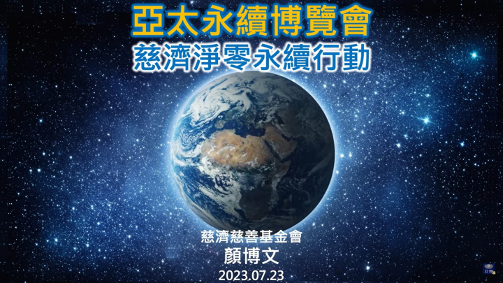 2021年慈濟宣示「淨零排放」,以科學方法訂立減碳里程,7月23日慈濟基金會顏博文執行長在2023年亞太永續博覽會由為大家說明淨零排放之重要,期待於2050年達成淨零排放目標。