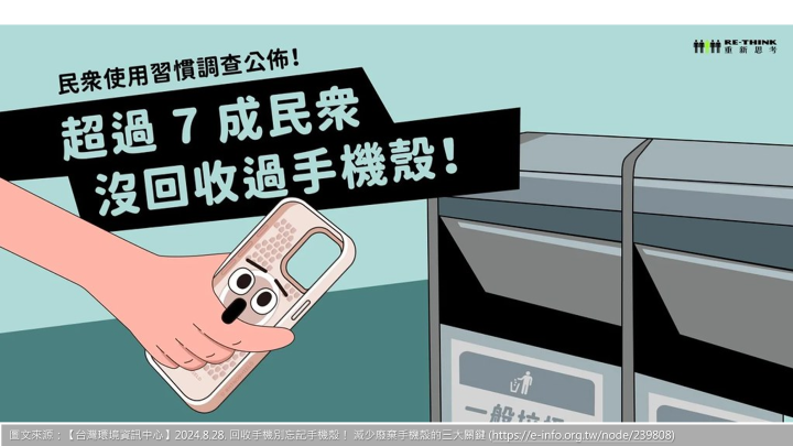 🌏【台灣環境資訊中心】2024.08.28. 回收手機別忘記手機殼! 減少廢棄手機殼的三大關鍵 (https://e-info.org.tw/node/239808)