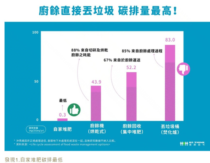 使用廚餘機和其他廚餘處理方式比,環保嗎?五種常見的廚餘處理方式,來看看不同處理方式的環境影響到底差多少?1.廚餘機:在製造階段以及運作(切碎、烘乾廚餘)時,皆會耗能、產生碳排放。2.廚餘回收:集中堆肥環境影響在於運送至堆肥場的運輸耗能,以及堆肥過程產生氣體排放。3.自家堆肥:省去了運輸耗能,幾乎沒有能源消耗,環境影響低。4.廚餘丟一般垃圾(錯誤方式):除了運送至廢棄物處理場的碳排,環境影響在於廚餘含水量高會增加焚化處理難度。5.廚餘沖馬桶(錯誤方式):廚餘倒入馬桶後,進入地下水處理系統,會增加廢水處理負擔,部分未經處理的廚餘可能流入環境、造成污染,也可能堵住你家馬桶!
