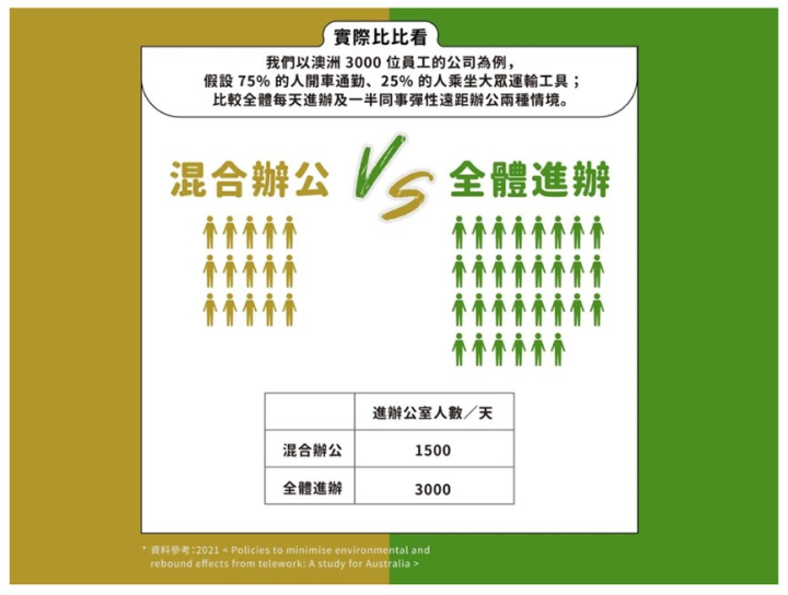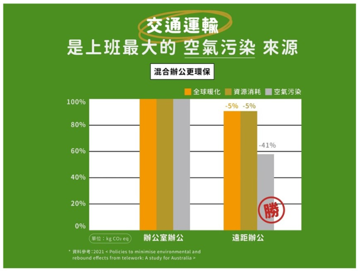 居家辦公、遠距工作,第一個想到的優點是可以省去通勤碳排!不過,在家開著電腦、吹冷氣等也都會耗電。一項發表於國際期刊的研究,以澳洲一家有 3,000 位員工的公司為案例,比較全體員工每天進辦公室上班,以及採取彈性遠距工作的環境影響。從四面向評估,研究以碳排放、資源消耗、空氣污染、人類毒性作為環境指標,來評估不同上班模式的影響。彈性遠距工作較環保!
