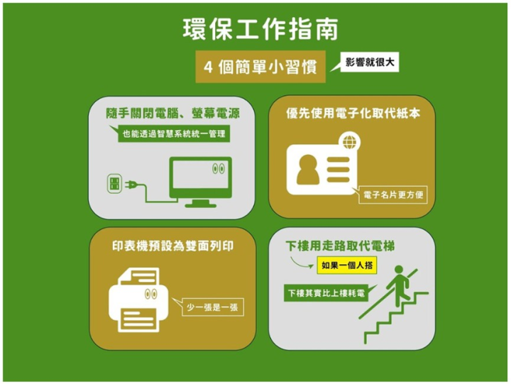 不管你是遠距工作還是進辦公室,養成以下四個簡單的習慣就能減少對環境的影響!1.隨手關閉電腦、螢幕電源 : 電腦、螢幕對能源消耗影響非常大!2.養成不用時隨手關閉的習慣,累積起來就能省下不少能源。3.電子化取代紙本 : 落實無紙化,能從源頭減少資源消耗。印表機預設為雙面列印 : 有些文件還是需要印出紙本,盡可能雙面列印,少印一張是一張!4.下樓以走路取代搭電梯