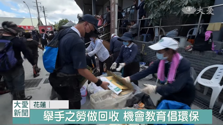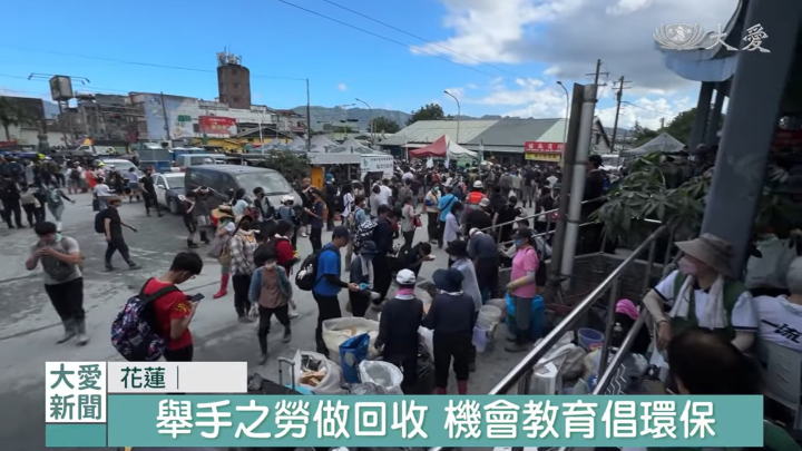 花蓮的光復火車站,自從災後,幾乎每天湧入大批打掃志工,當然人多產生的垃圾量也跟著增多,慈濟成立的資源分類區,回收量從平常日的六十多袋,在教師節連假的這二天,回收量變成一天快九十袋。