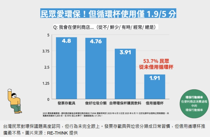 RE-THINK與全家連續第二年發布《2025環保素養調查-便利商店篇》,透過問卷調查發現,民眾普遍對環保議題有高度認同感與積極度,垃圾分類、發票存載具等行動駕輕就熟,但有53%的民眾從未借用循環杯。自帶環保杯(3.91 分)與借用循環杯(1.91 分)表現仍有待加強,主要障礙來自「忘記攜帶」、「不便使用」以及「衛生與信任疑慮」。