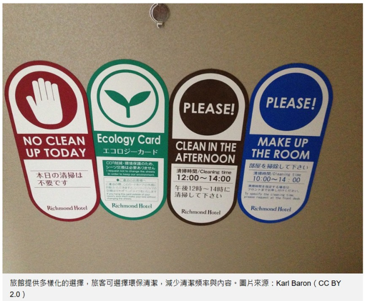 旅遊業吹起永續風,「環保住宿」愈來愈常見。有些旅館將省下來的成本以折價券、積點等方式回饋旅客,有些則回饋給地球──減少一晚房務清潔就種下一棵樹。英國薩尼亞飯店:跳過打掃,換來千棵新樹;在台減少飯店清潔化作淨灘、環境教育,宜蘭的礁溪老爺酒店曾在2021年與RE-THINK淨灘行動合作,連住兩晚搭配續住不打掃,則加贈環保抵用金500,累計兩年共捐出15.7萬元。