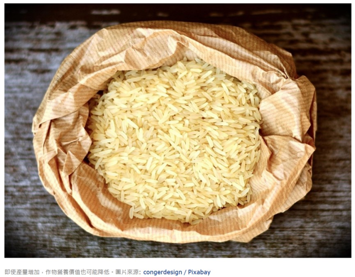 研究指出,對於水稻、玉米、小麥等大多數植物來說,較高的二氧化碳濃度確實會增強光合作用並提高生長率,但是這並非毫無代價,因為這意味著氮含量將減少,並削弱植物生產蛋白質和胺基酸的能力。一段時間後,作物體內的鈣等關鍵礦物質和抗氧化化合物的成分就會開始減少,導致營養成分下降。