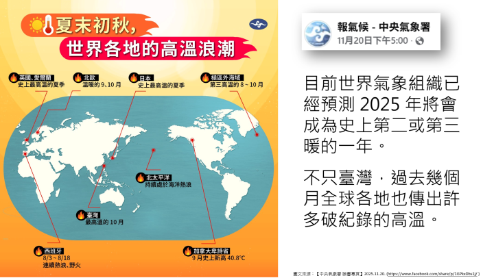🌏【中央氣象署 臉書專業】2025.11.20. 世界氣象組織預測 2025 年將會成為史上第二或第三暖的一年