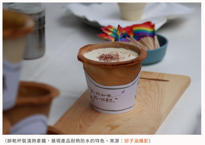 口的餅乾杯。消費者不只能品嚐飲品,連杯子都能吃下肚,真正落實環保與美味兼具。他們用這創新方式出現在市集和活動裡,讓更多人重新思考紙杯背後的塑膠淋膜污染問題,將永續理念融入每一口生活。