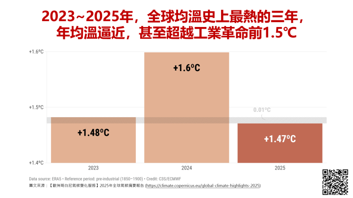哥白尼氣候變化服務在年度報告指出,過去3年全球平均氣溫首次超過工業化前水準1.5°C。