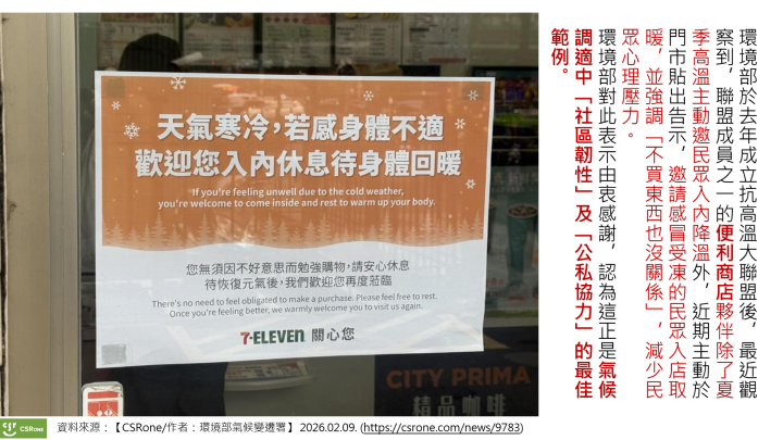 🌏【CSRone-作者:環境部氣候變遷署】2026.02.09. 因應氣候變遷挑戰,環境部與衛福部聯手強化調適作為 (https://csrone.com/news/9783