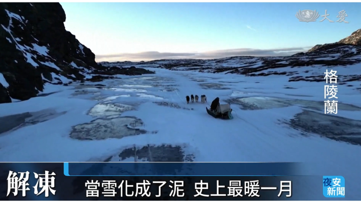 全球暖化,造成海水升溫,正在改變格陵蘭的生態。當地1月到2月的氣溫比往年同期高出攝氏4.9度,格陵蘭創下新的高溫紀錄,冰雪消融,雪橇手和雪橇犬出行,因為得在裸露地面上前行,變得更加困難。