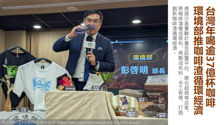 🌏 【中央通訊社】2025.12.30. 台灣年喝逾37億杯咖啡 環部推咖啡渣循環經濟 (https://cna.com.tw/news/ahel/202512300126.aspx