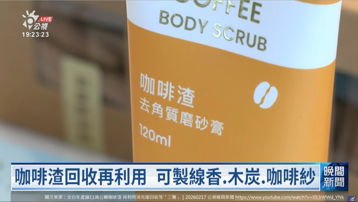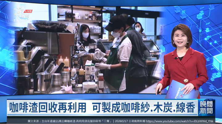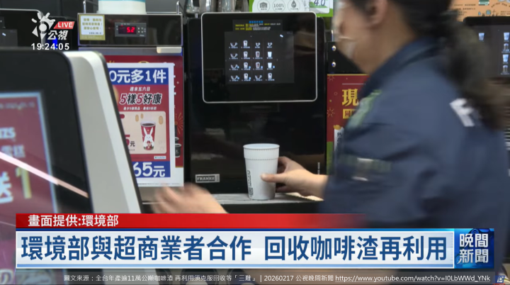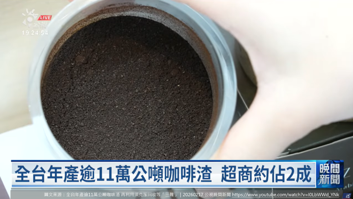 🌏 全台年產逾11萬公噸咖啡渣 再利用須克服回收等「三難」|20260217 公視晚間新聞 (https://www.youtube.com/watch?v=I0LbWWd_YNk