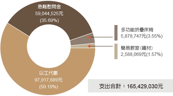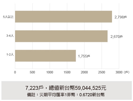 依據家中口數而援助不同金額 金額訂定:經與當地政府商討並應災民所需所制定 發放對象:由市政府提供名單並協助製作名冊 |