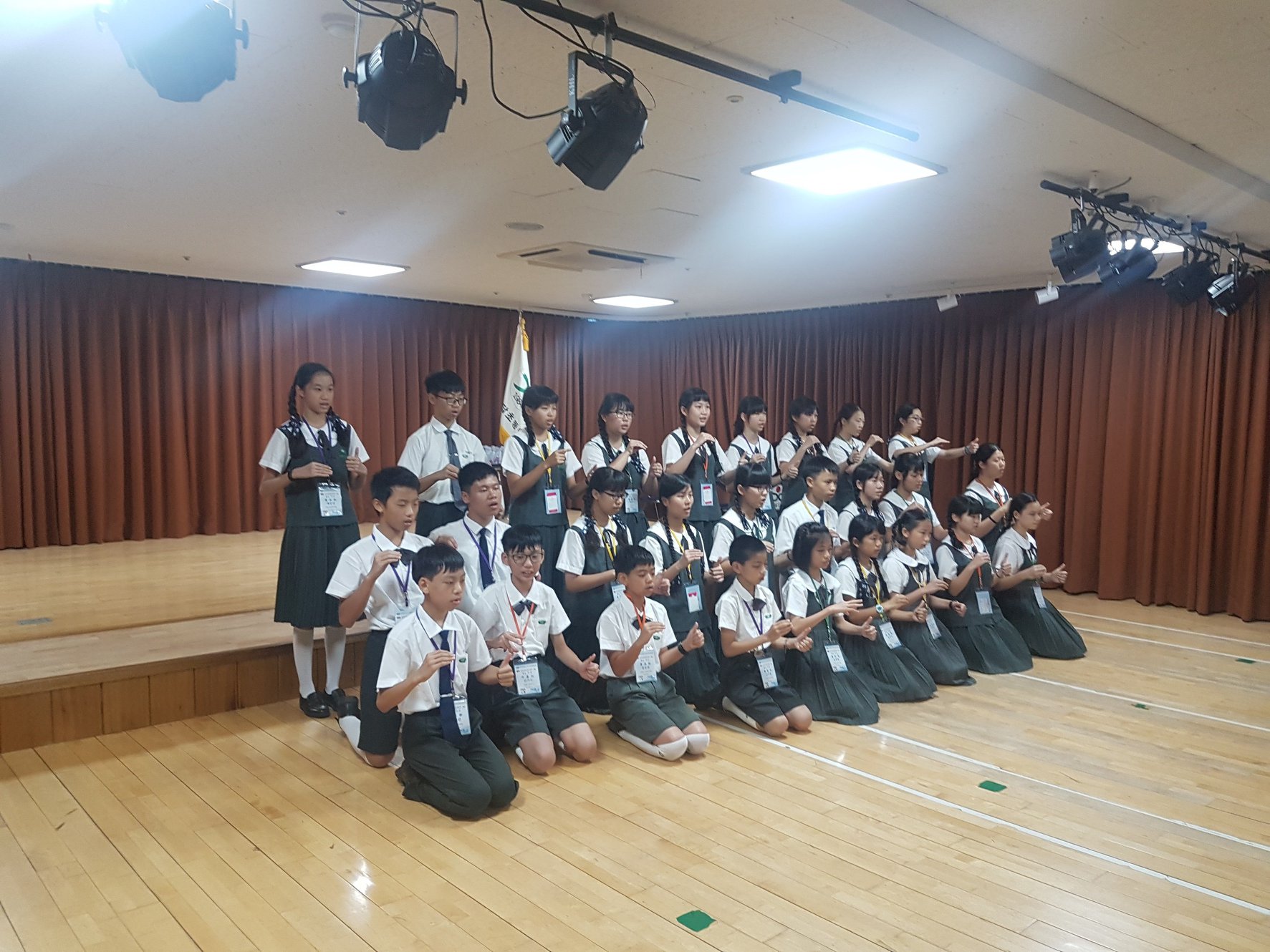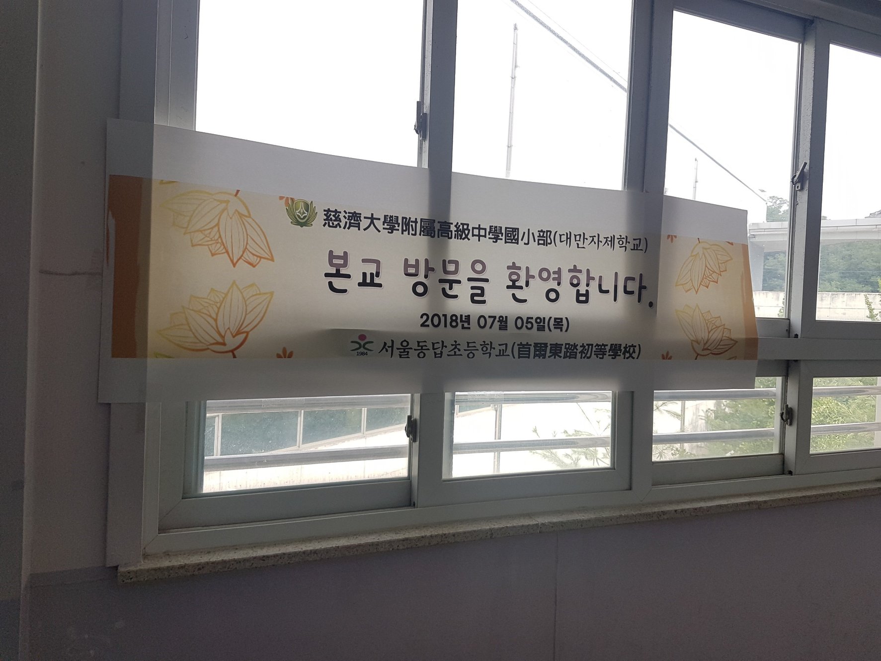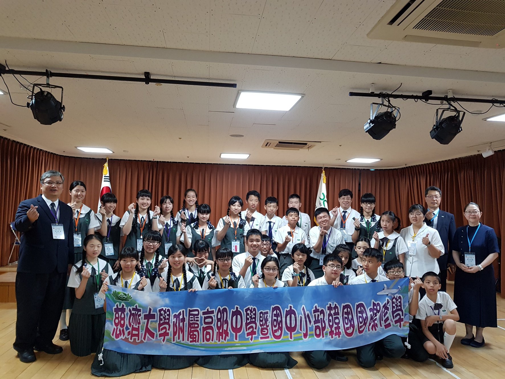 接下來的歡迎式,主任致詞先恭喜韓國在世界杯足球賽擊敗了德國,友校的師生馬上露出了歡樂的笑容,拉近了彼此的距離。慈中將教室移到首爾,移到東踏國小。因此,我們也希望東踏國小也能夠將教室移到花蓮,移到慈大附中來,東踏國小師生預計在11月一起來參加慈中校慶國際運動會,大展身手,我們竭誠歡迎。緊接著,在東踏國小吉他表演後,就是慈中學生的「校歌」與「彩色的翅膀」表演,生動的手語表演獲得滿堂彩,伴隨者熱烈的掌聲,台下的韓生也隨者節奏比著手語。完美的演出背後一定有一位很好的師長,這位師長就是懿勤媽媽,他花了好幾個小時在中午、假日與晚上指導學生手語,非常感恩她的付出。