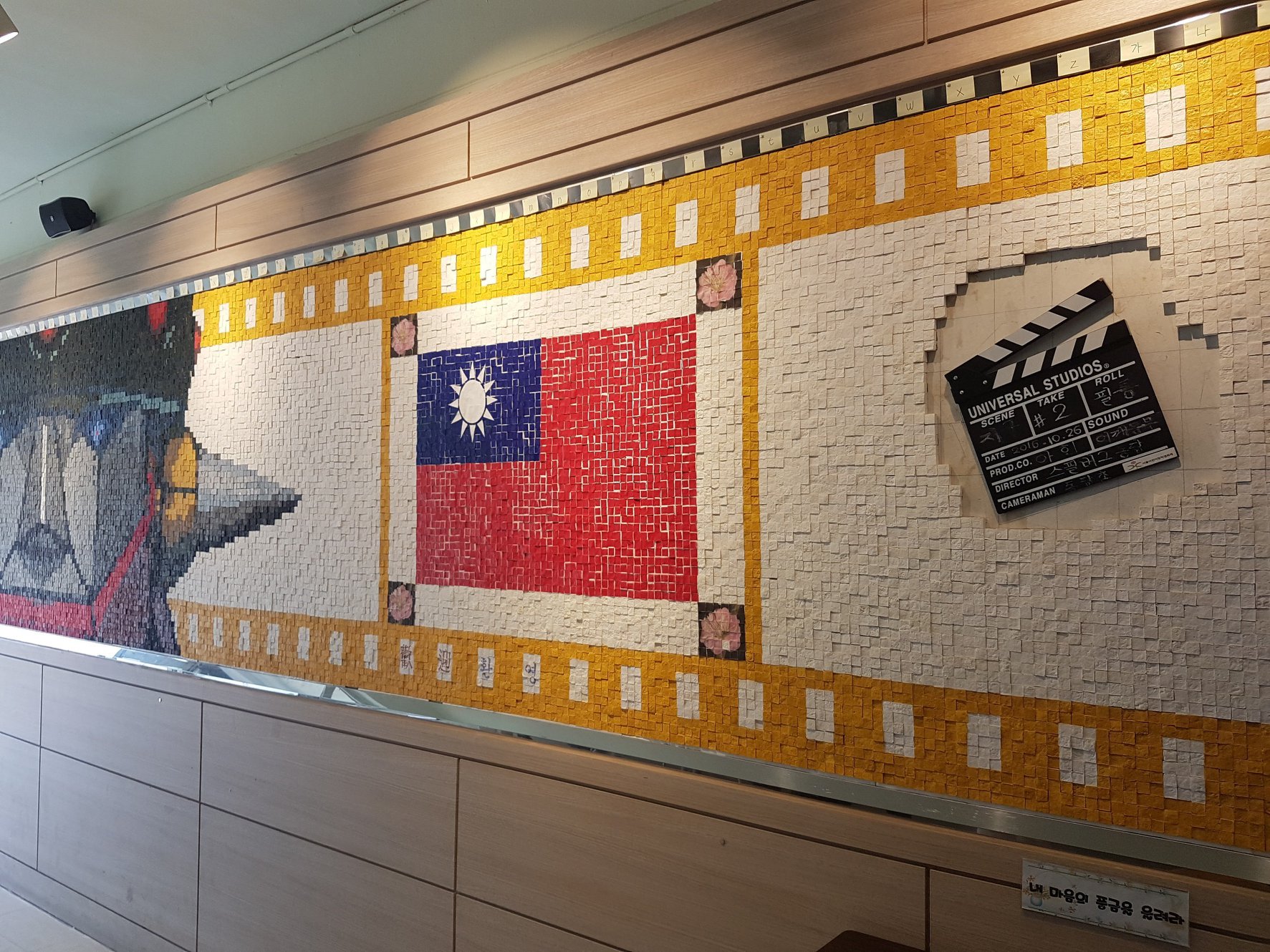 第二日進入此行大重點之一「學校交流」,車子一轉入巷弄就看到姊妹校東踏國小崔校長在門口迎接,小朋友則揮舞中華民國的國旗熱烈歡迎我們的到來,真的揪感心啊!接下來,校長帶領師生,參觀圖書館與一年級的教室,學校雖然小,但佈置相當有藝術感,每間教室都有特色主題,有的教室甚至有小舞台。轉入川堂,感動的畫面出現了,牆壁上出現了一幅用小小紙盒壓縮的方塊做成的中華民國國旗,可見東踏國小,對交流的重視程度。
