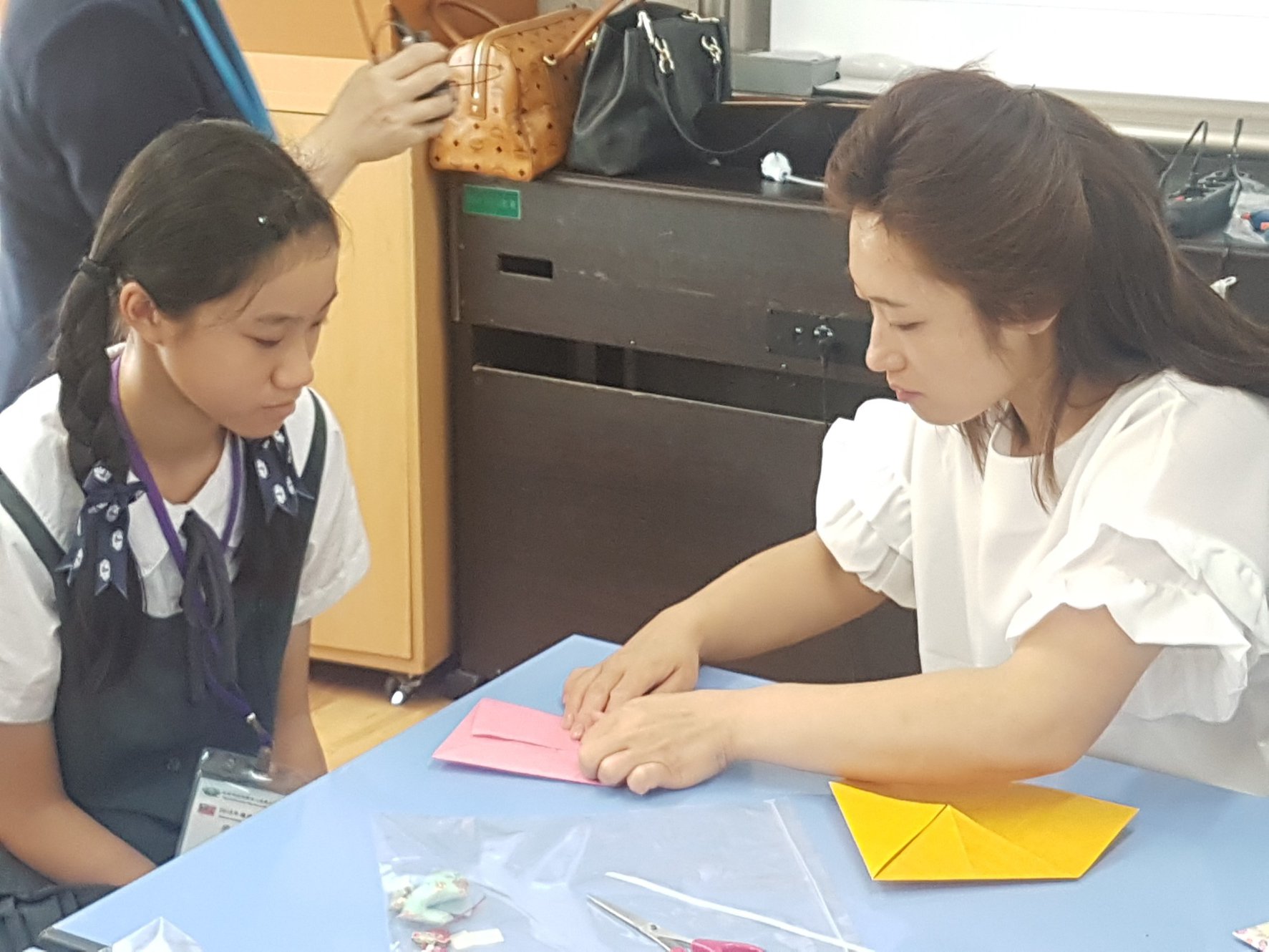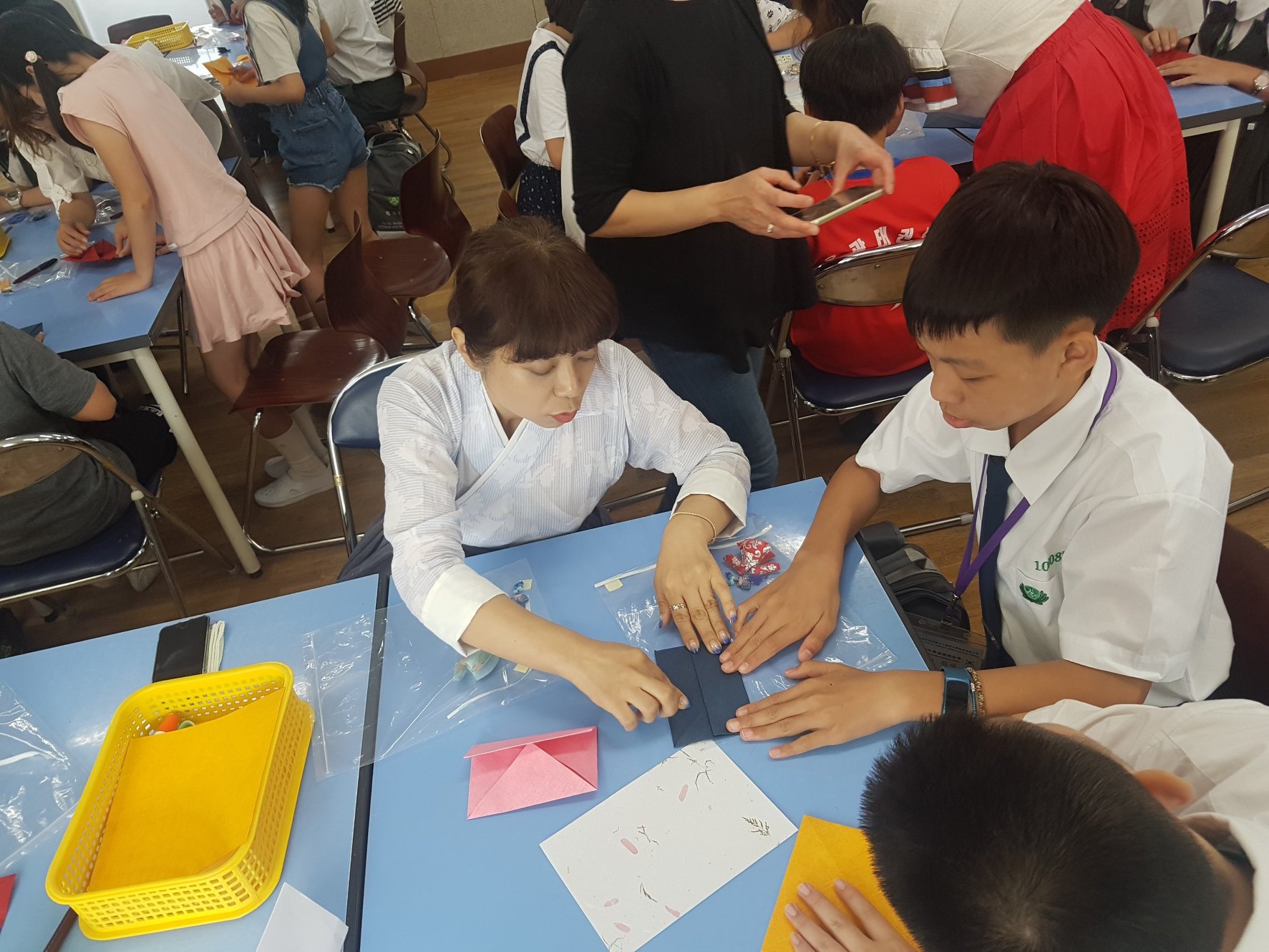 兩校同學一起上課,也許互相聽不懂對方的語言,但透過簡單的英語溝通-one、two、turn right、turn left,也可以協作機器人指令操作,不然就是透過實作摺紙製作韓服洋娃娃,利用肢體語言展現協作的實力,也是非常令人感到驚奇,還好只有體驗兩節課,不然學生就會黏在東踏,不回花蓮了。