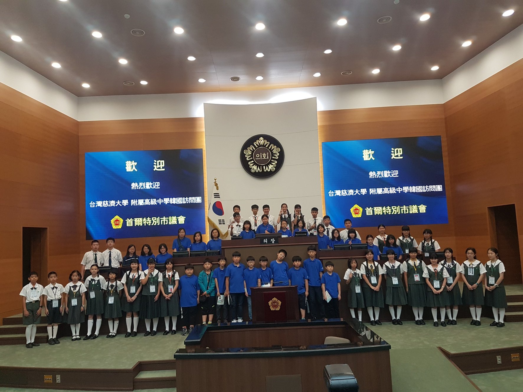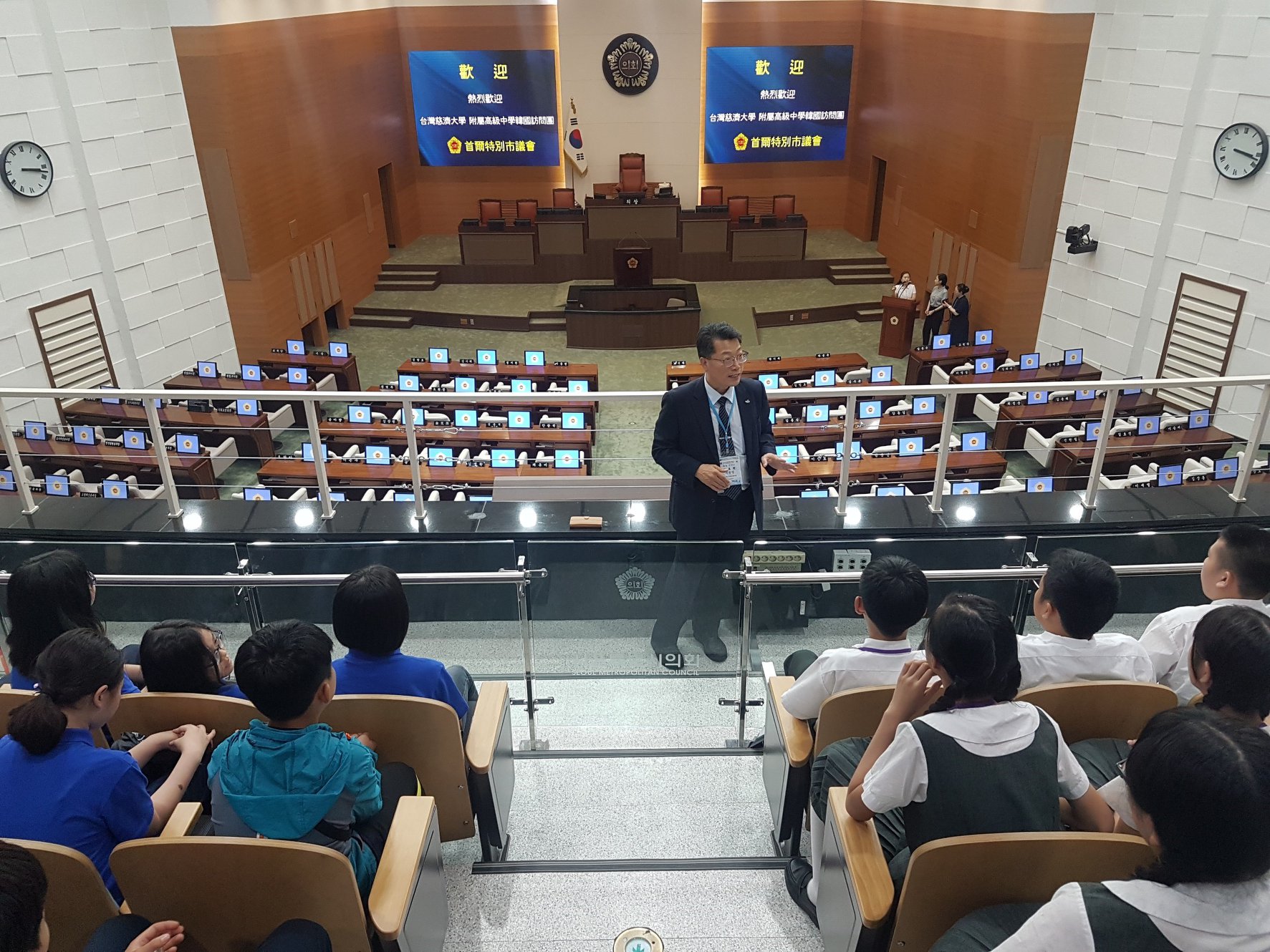 我們讓國際視野更拓展到認識民主政治差異,特地安排學生參訪韓國首爾市議會,認識首爾市議會的功能,市議會議長下設二個副議長及一位事務處長。透過解說學生了解議會的運作情形,同時讓學生體驗站到主席台,感受如歷其境的議事氛圍。