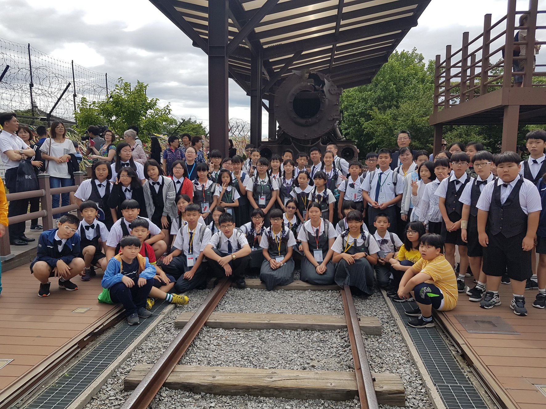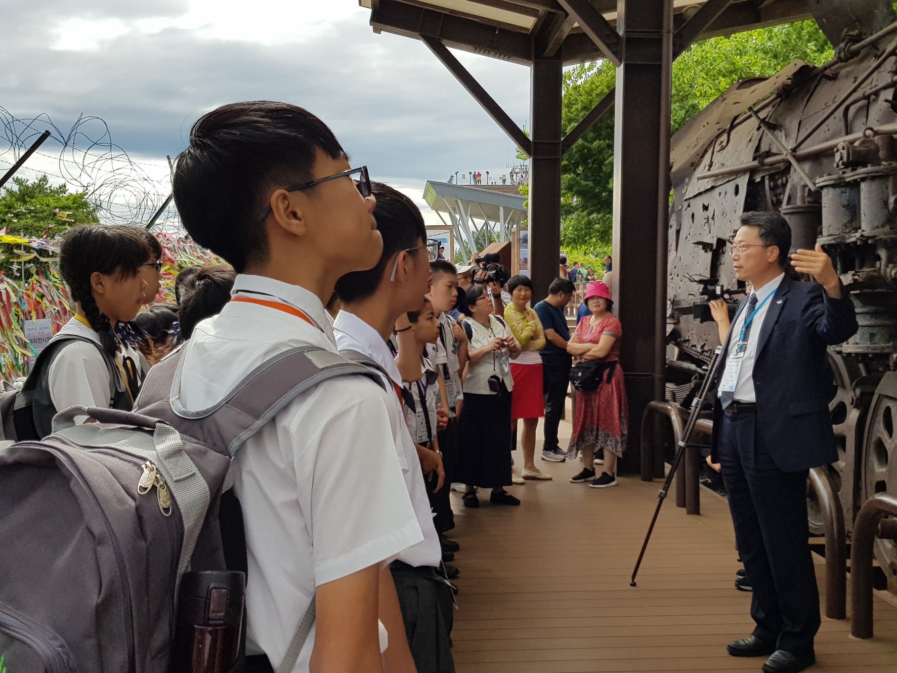 同學眼前的蒸汽火車上一個一個的孔洞是韓國戰爭時期被炸而脫軌後,在非武裝地帶被移送超過半個世紀的南北分裂的象徵物,朴師伯眼眶泛紅說,你能想像當時人們逃難的傷痛嗎?南北韓爆發戰爭之後,許多人搭著火車離開北韓,而兩邊分裂時之後在這裡再也回不去北韓或南韓建家人了,只能站在「望拜壇」紀念對方的家人。