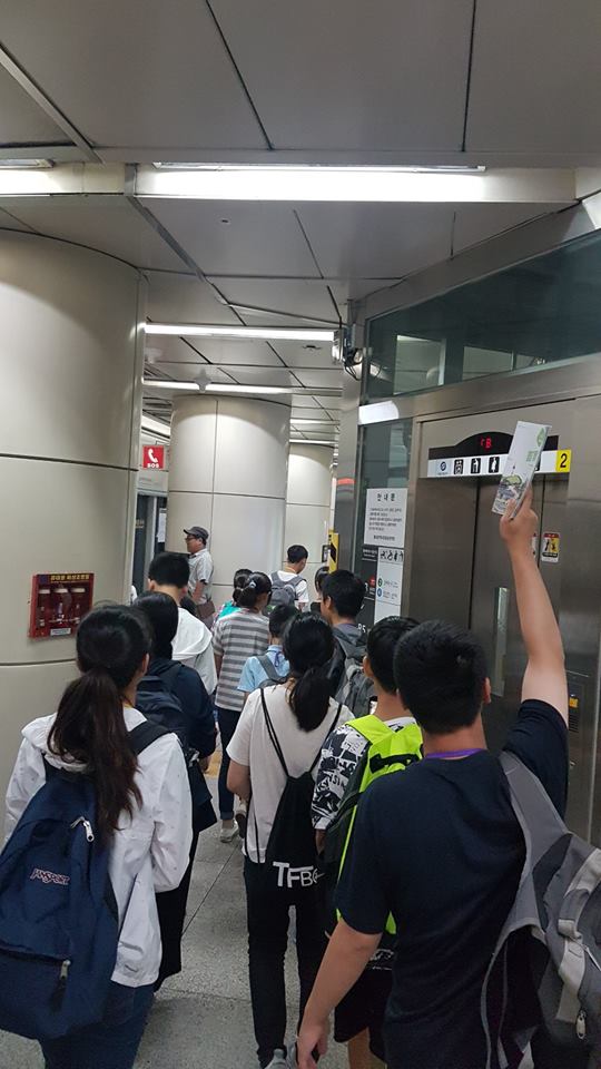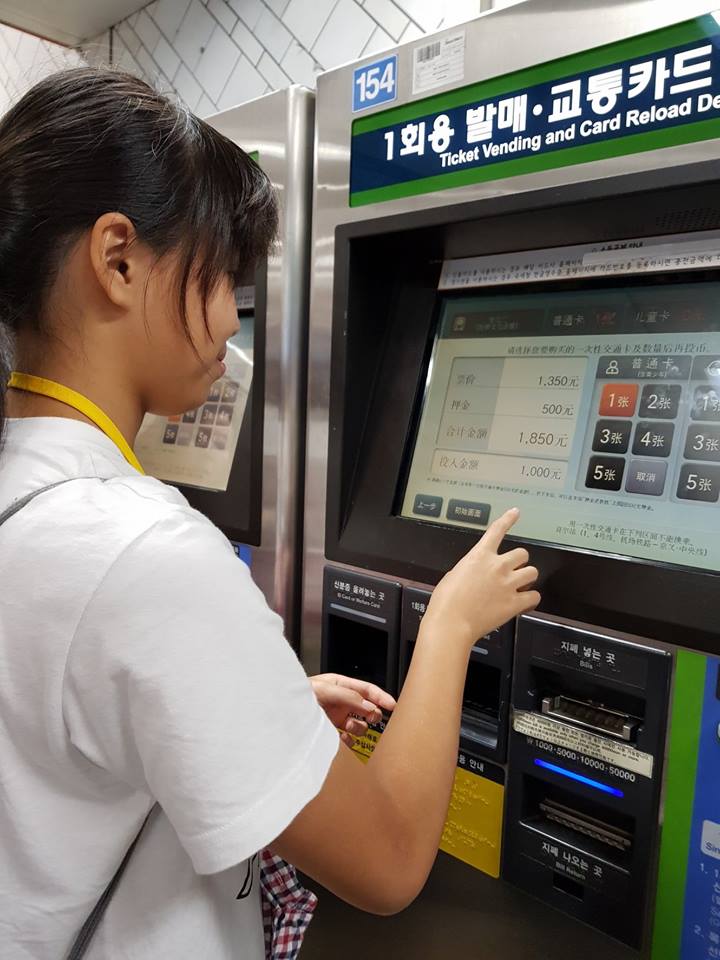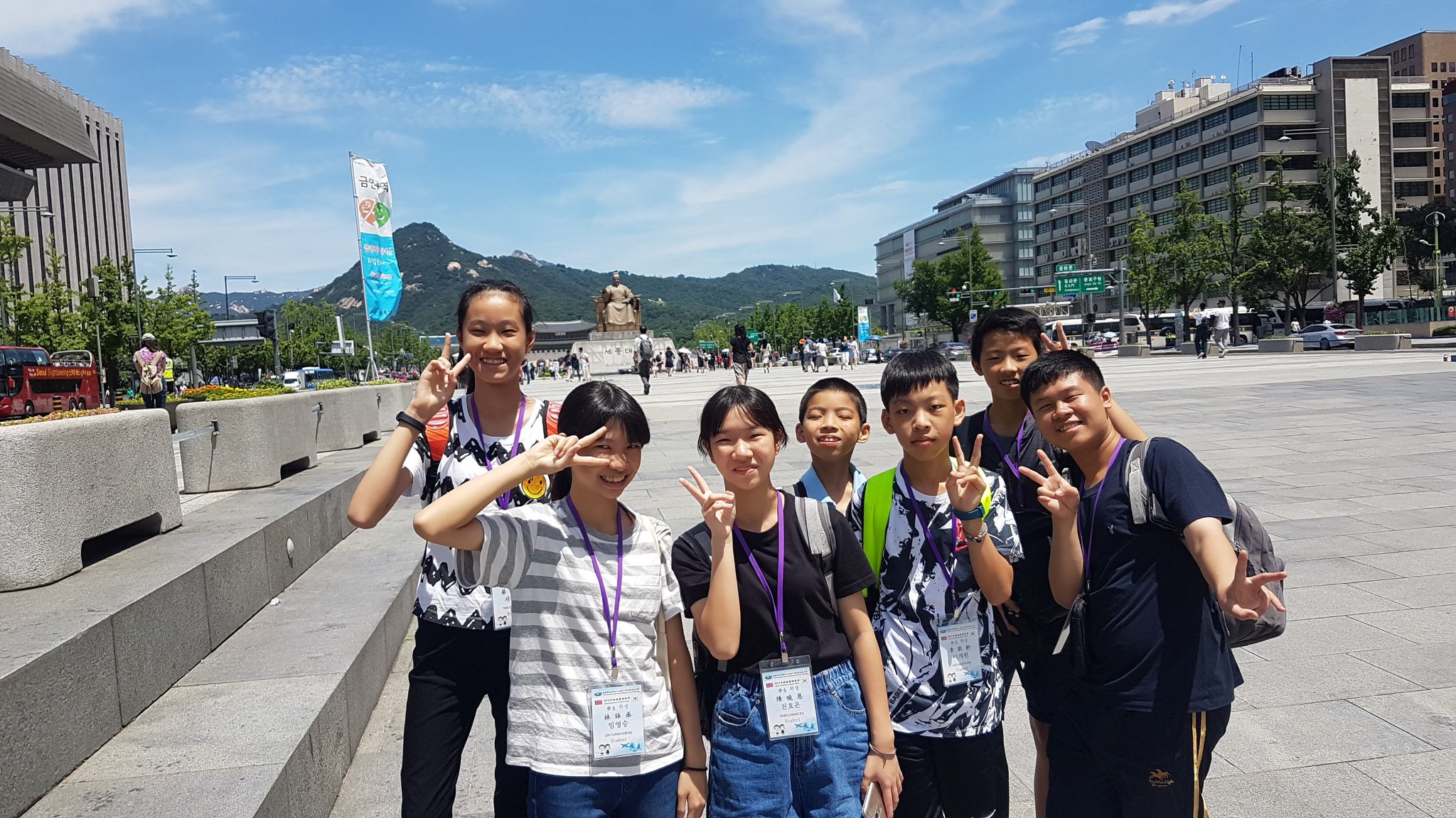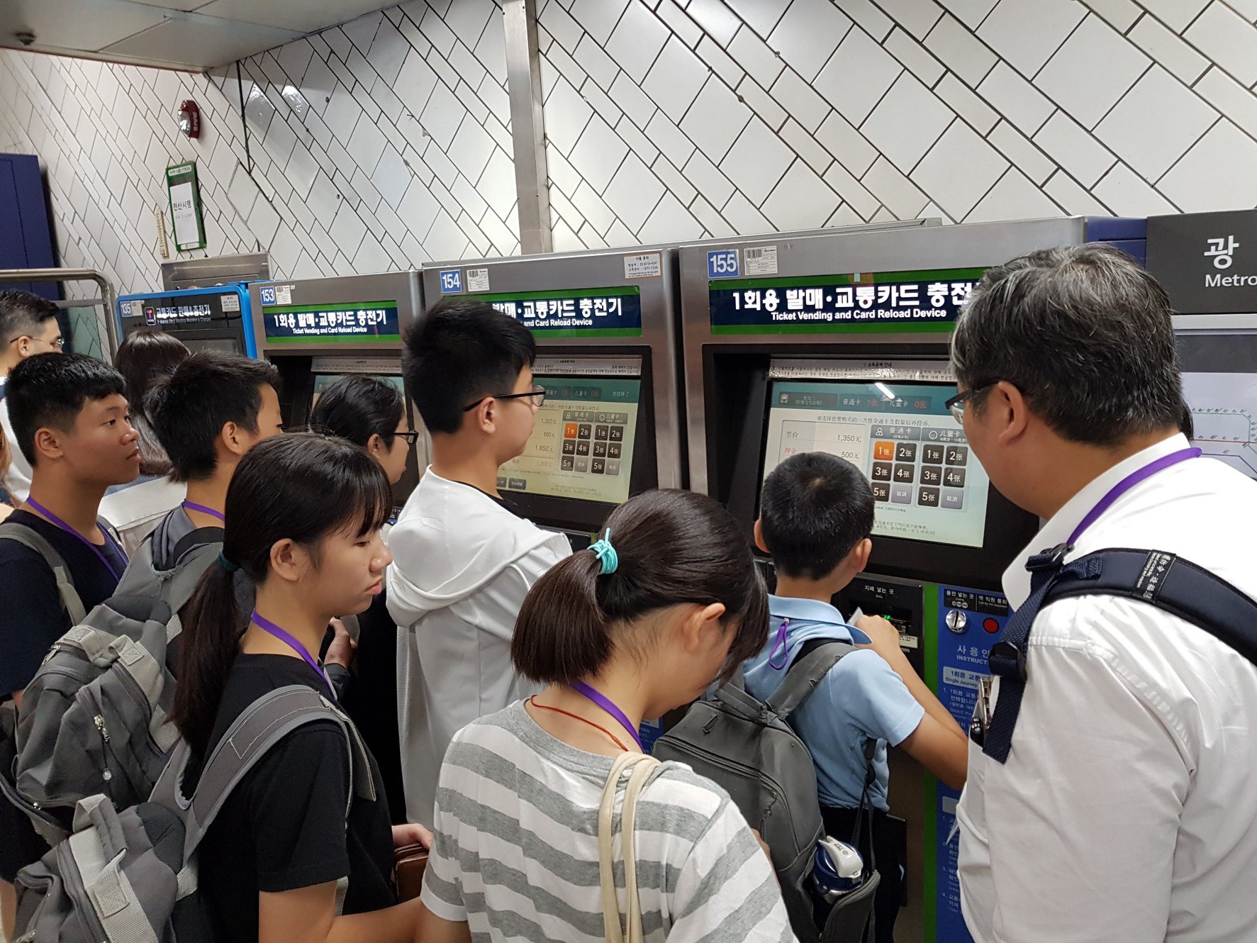 接下來,大家到達明洞地鐵站外,在主任與老師的叮嚀後,同學們就要出發囉!首先,同學在地鐵站裡學會了買票的步驟,順利買到地鐵票,然後看首爾地鐵地圖學會換搭不同支線去到要去的目的地,因為不是所有的地方都有中文可以看,所以搭地鐵的難度有點高喔!到底他們去了哪些地方呢?首爾塔、明洞街區、光化門廣場(世宗大王與李舜臣將軍銅像)、教保文庫、清溪川等地點,不簡單的事同學們能在規定內集合完畢,一人不少,創下本校年紀最小國際修學達標之新紀錄,真是相當不容易,請大家鼓掌。