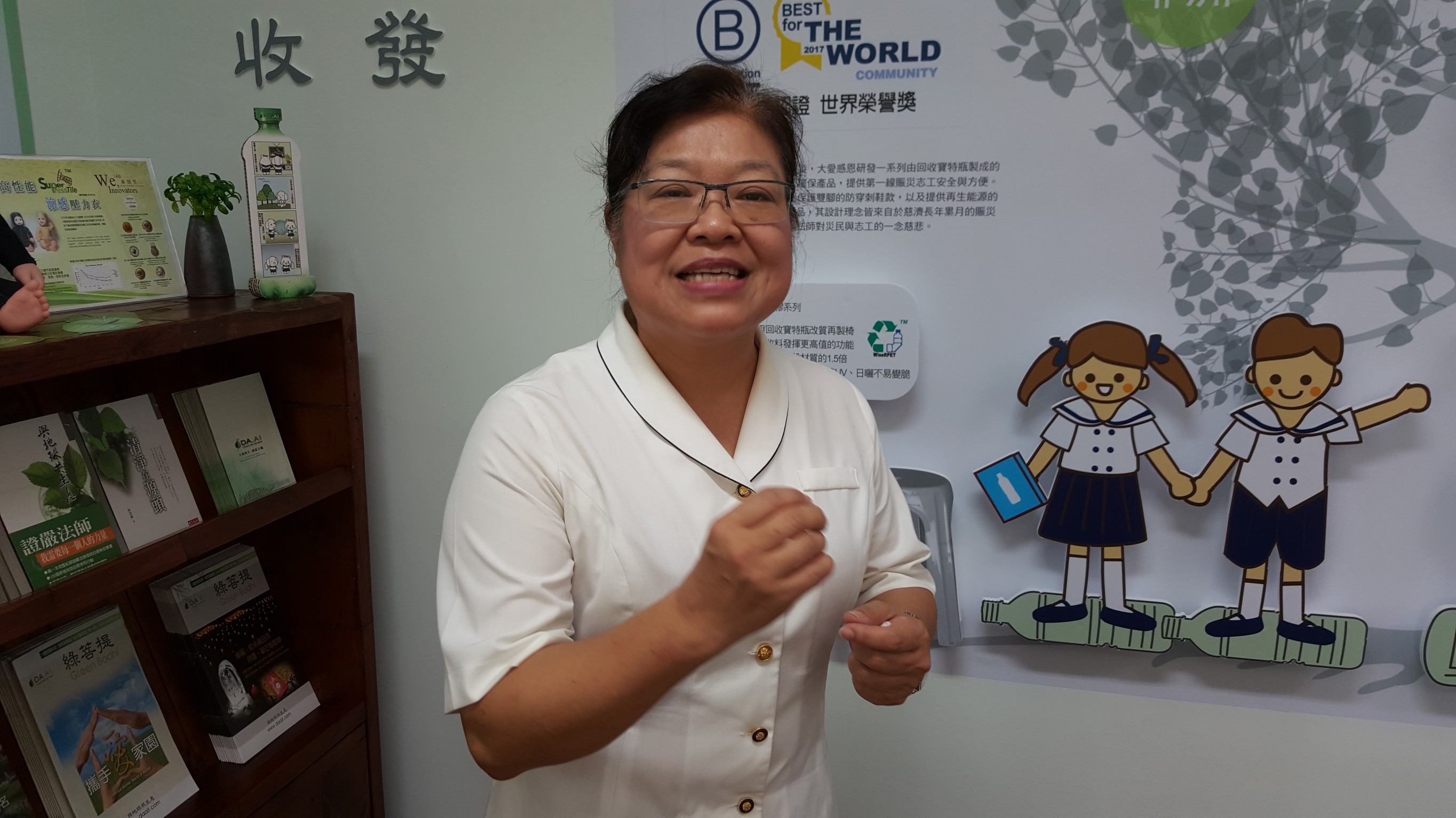 靜思書軒營運長 蔡青兒:「我們的精神來源來自於上人的心, 上人的方向, 所以靜思書軒給予一個方向, 都是上人的法 落實在慈濟宗門,就是在我們這個大愛感恩的館, 把它力行變成是,如何愛護這個大地 。」