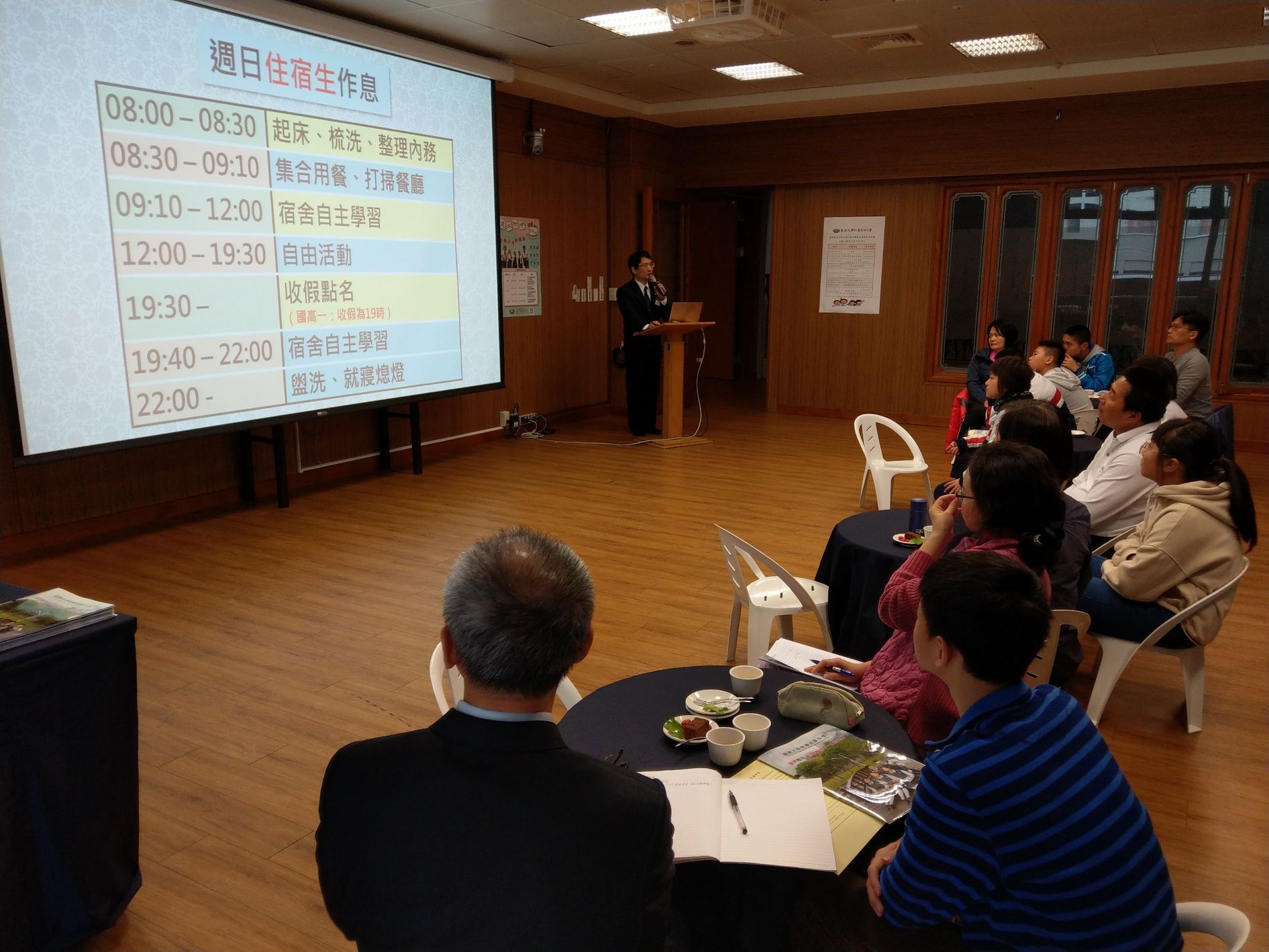 說明會開始,美燕老師最佳主持人引言,成財主任開始介紹慈中特色,11:00學生進行性向測驗,家長們就是溫馨座談,主任,慈誠爸爸與家長分享慈中所見所聞。