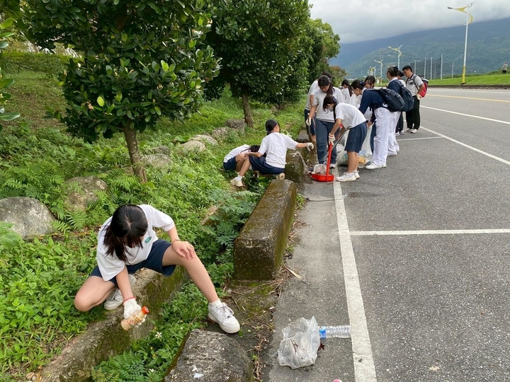 一行人隊伍浩蕩長來到校園的四號門,走出戶外用志工付出的方式來守護花蓮!國二知足的區域是體育高中,師生們沿路沿著體育館圍牆依組別劃分區域開始撿垃圾和回收品,大家各司其職相互配合的很好。