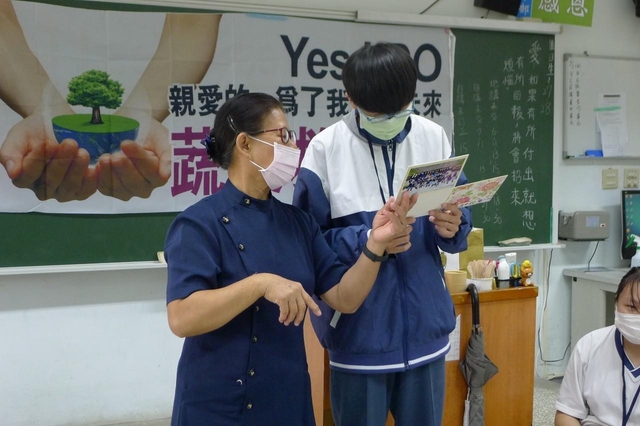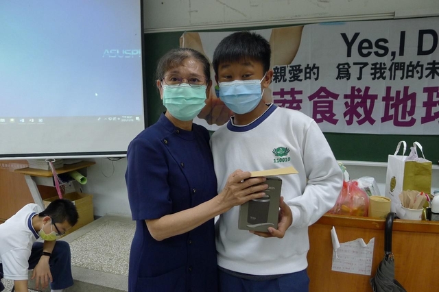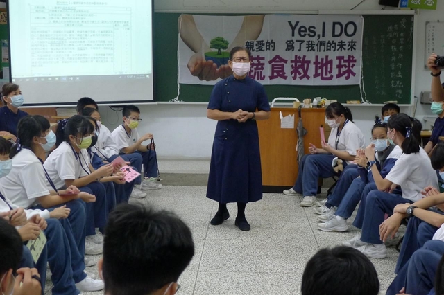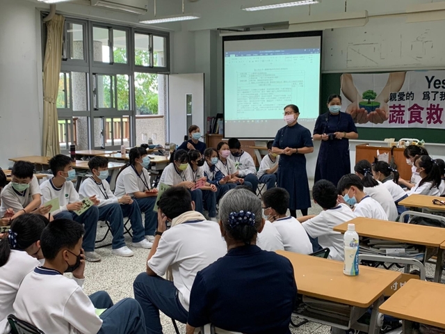 今天從屏東帶來了一條蔬食布條,媽媽將他掛在黑板上,斗大的字掛在那兒,相信孩子們會看得更清楚。