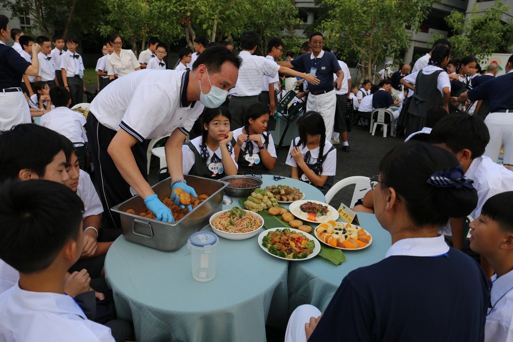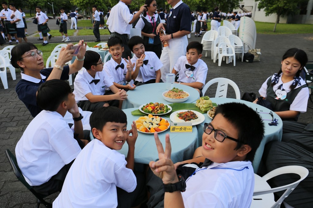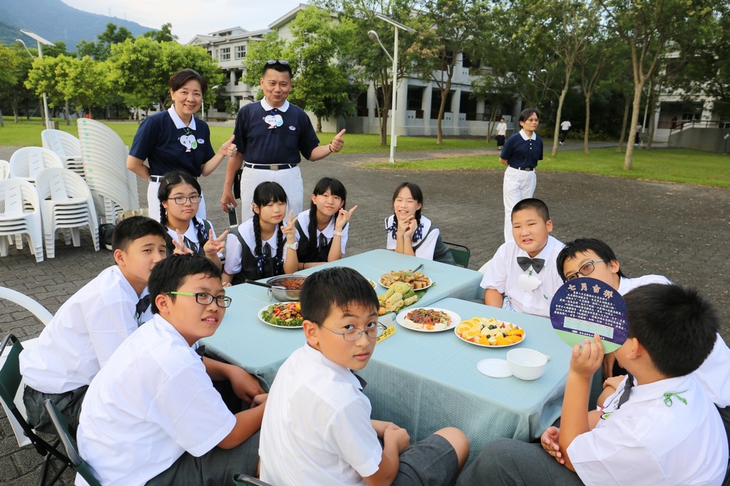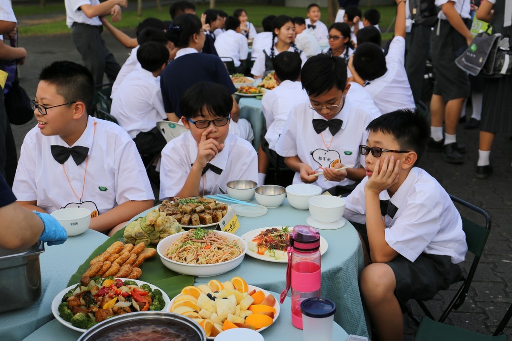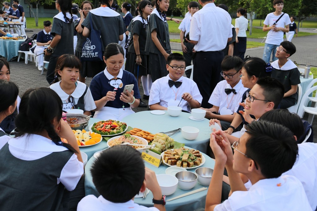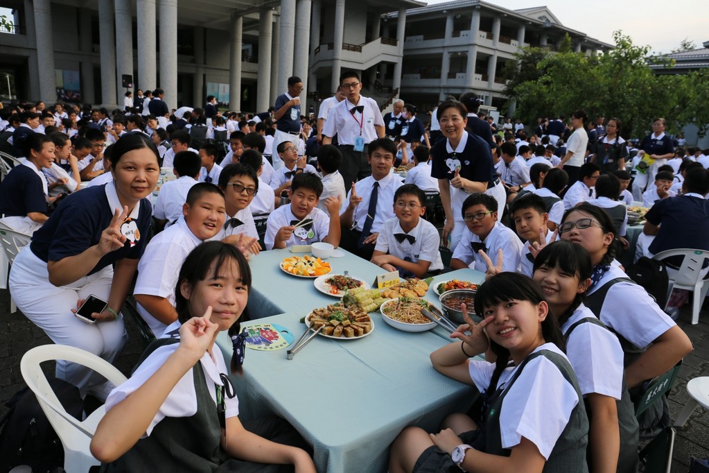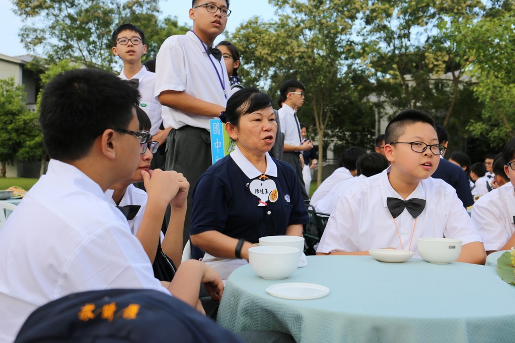 在傍晚時分迎新晚會由國一搖呼拉圈及高一跳繩中進場入座,在學長姊及懿德爸爸媽媽準備了手語演繹中展開晚宴的序曲。懿德媽媽爸爸將早上合心班合影的團體照手工卡片分送給每位同學,妙膳廳則準備了豐盛的晚餐及深具人文的擺盤讓同學們食指大動,薯餅和美味的菜餚很快的就一掃而空,同學在歡笑中讓留下美好的記憶。