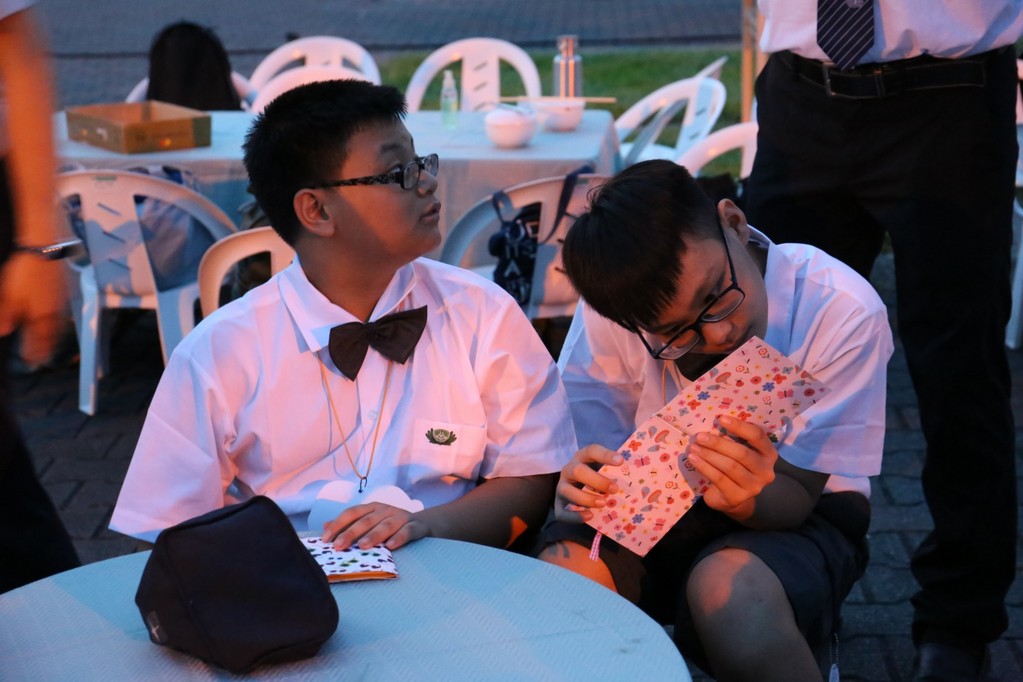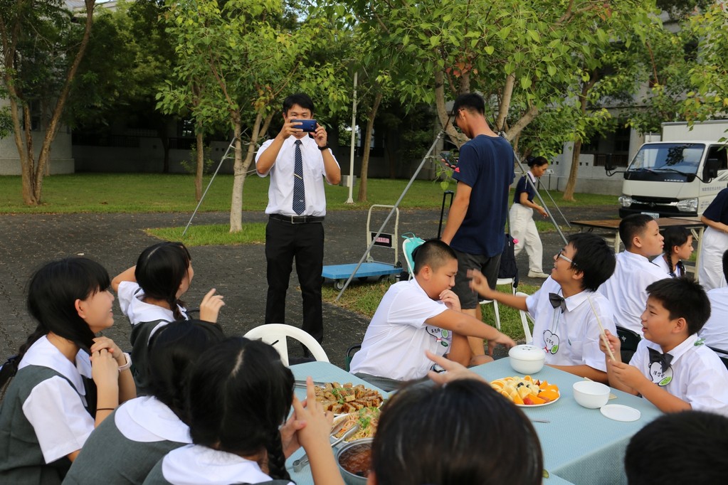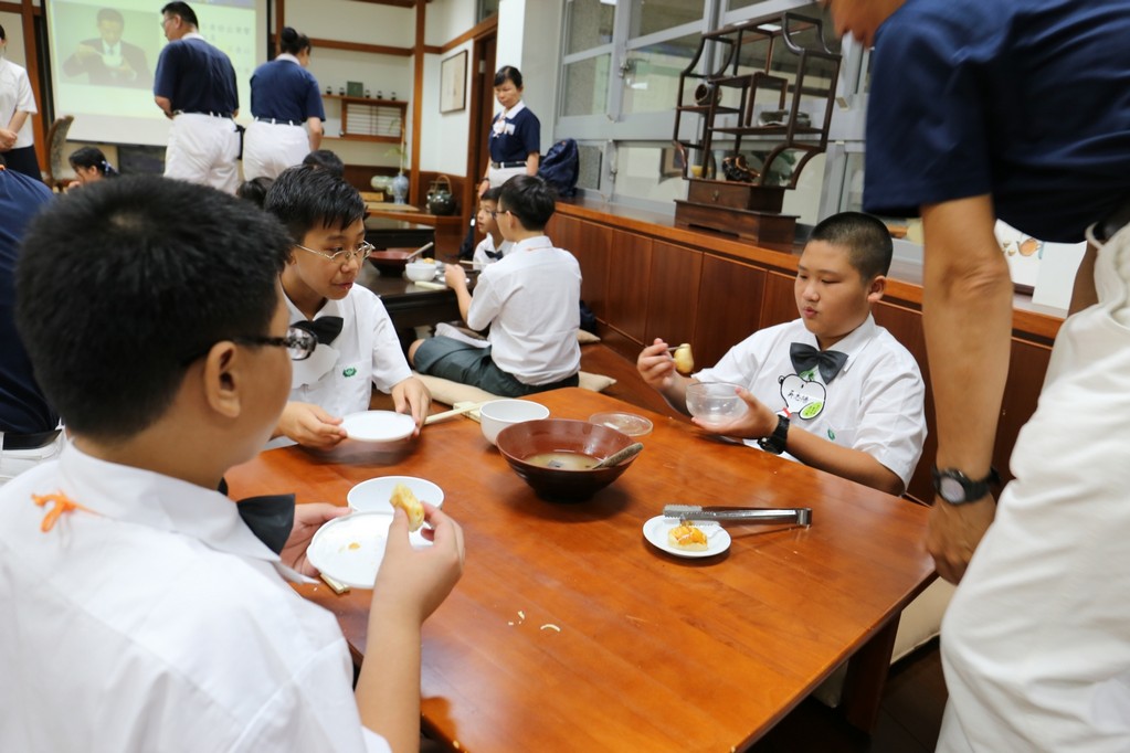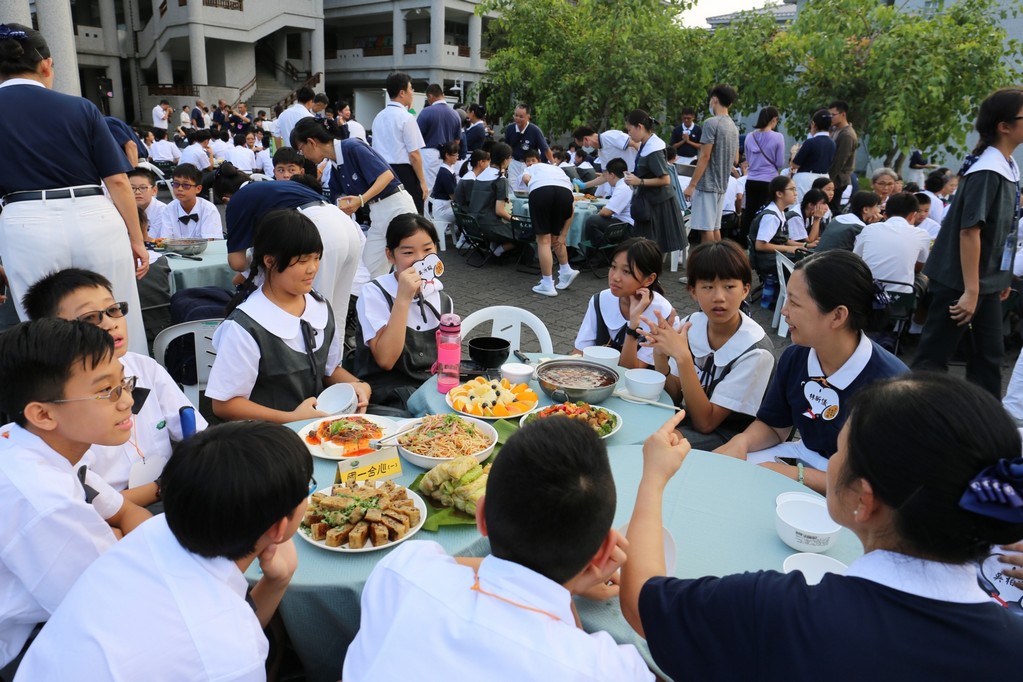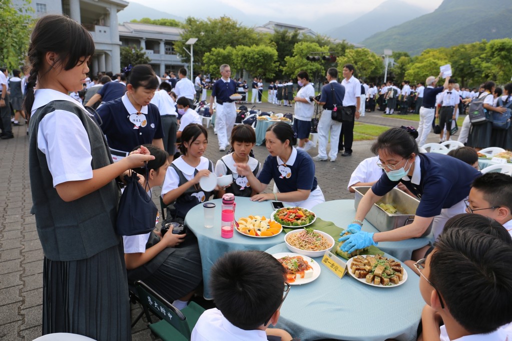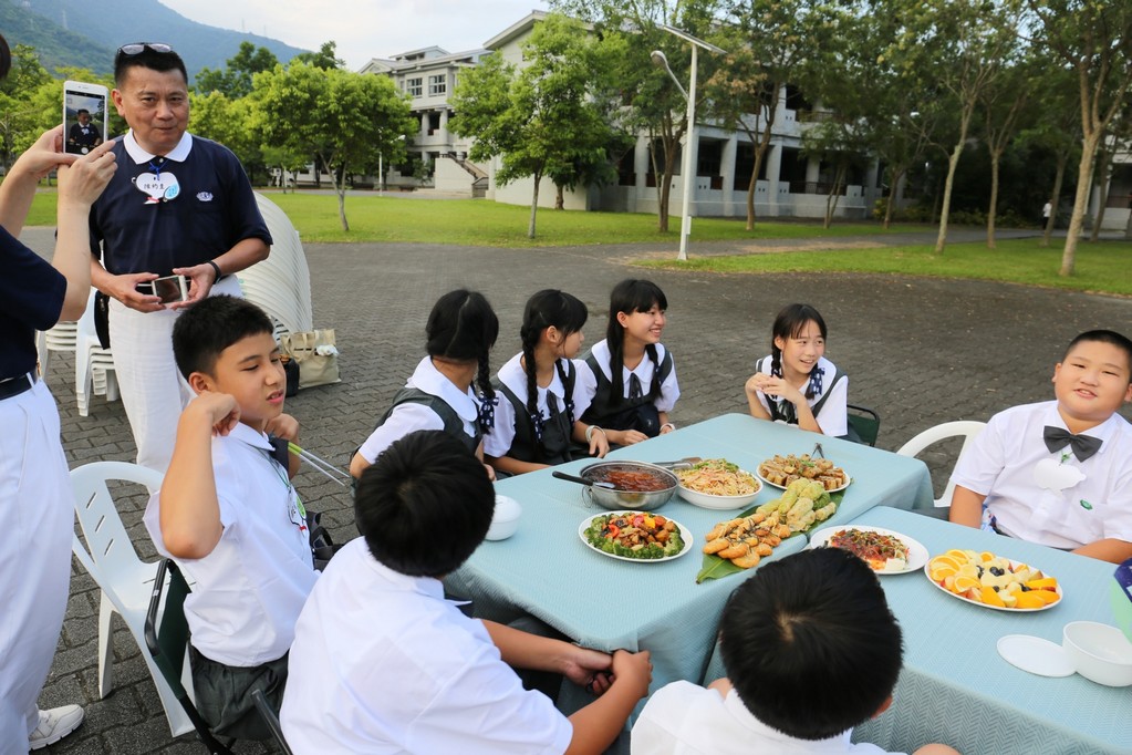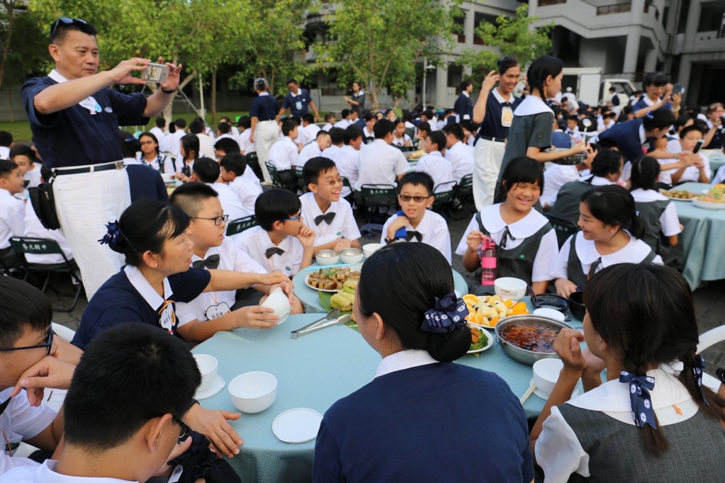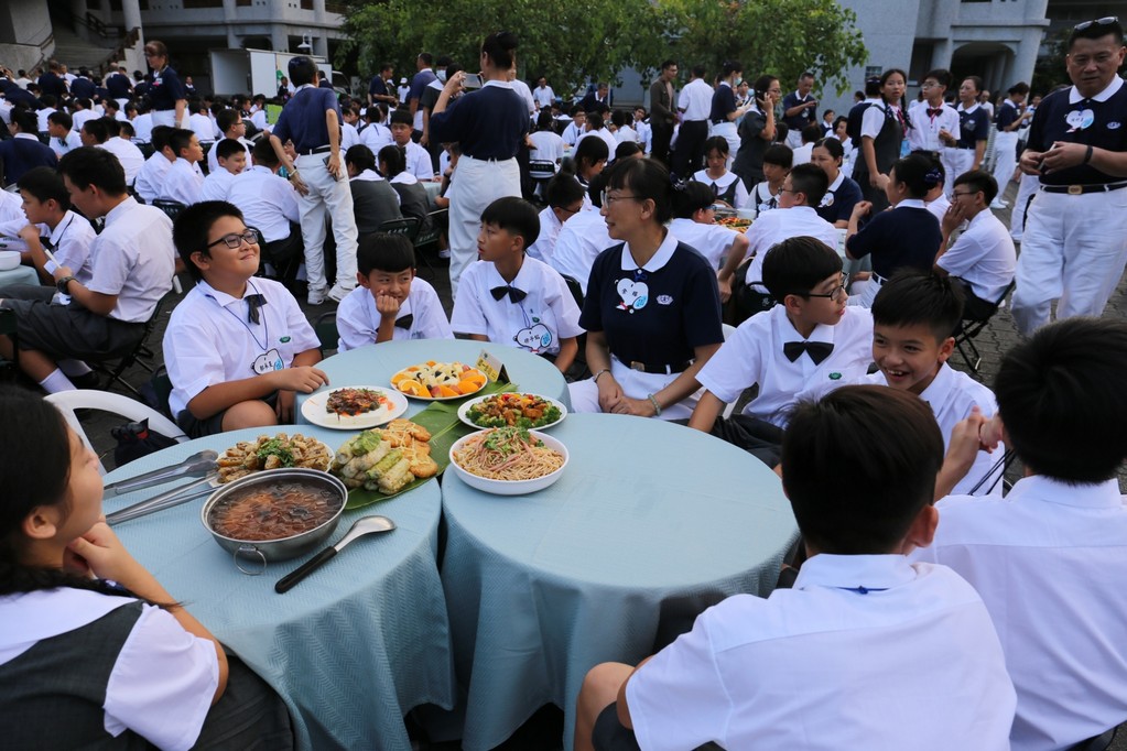 在傍晚時分迎新晚會由國一搖呼拉圈及高一跳繩中進場入座,在學長姊及懿德爸爸媽媽準備了手語演繹中展開晚宴的序曲。懿德媽媽爸爸將早上合心班合影的團體照手工卡片分送給每位同學,妙膳廳則準備了豐盛的晚餐及深具人文的擺盤讓同學們食指大動,薯餅和美味的菜餚很快的就一掃而空,同學在歡笑中讓留下美好的記憶。