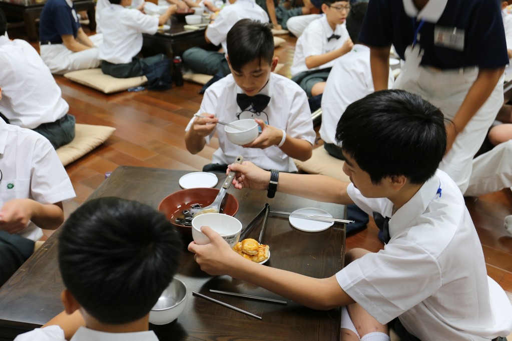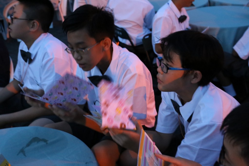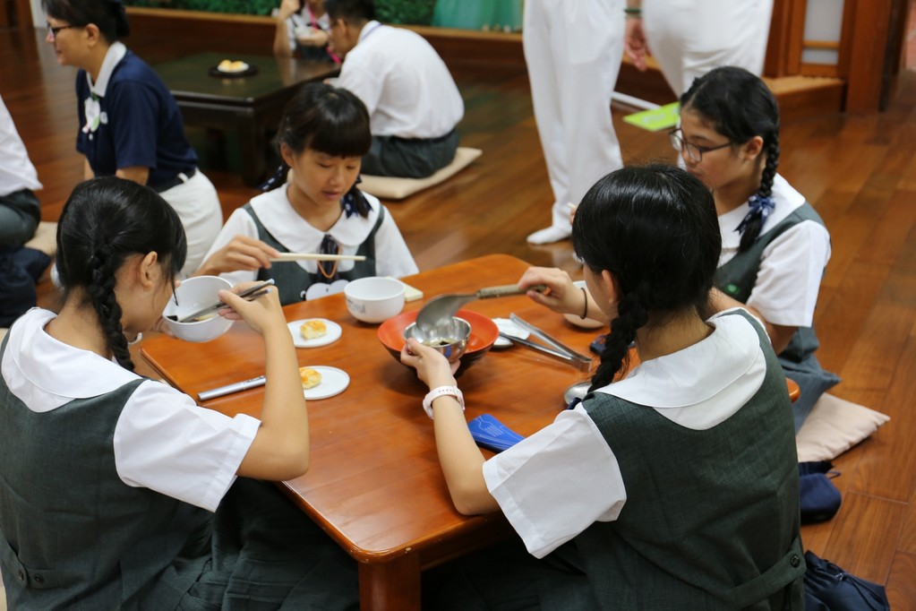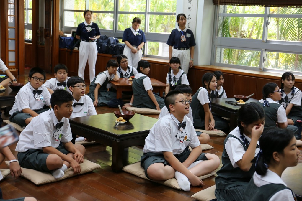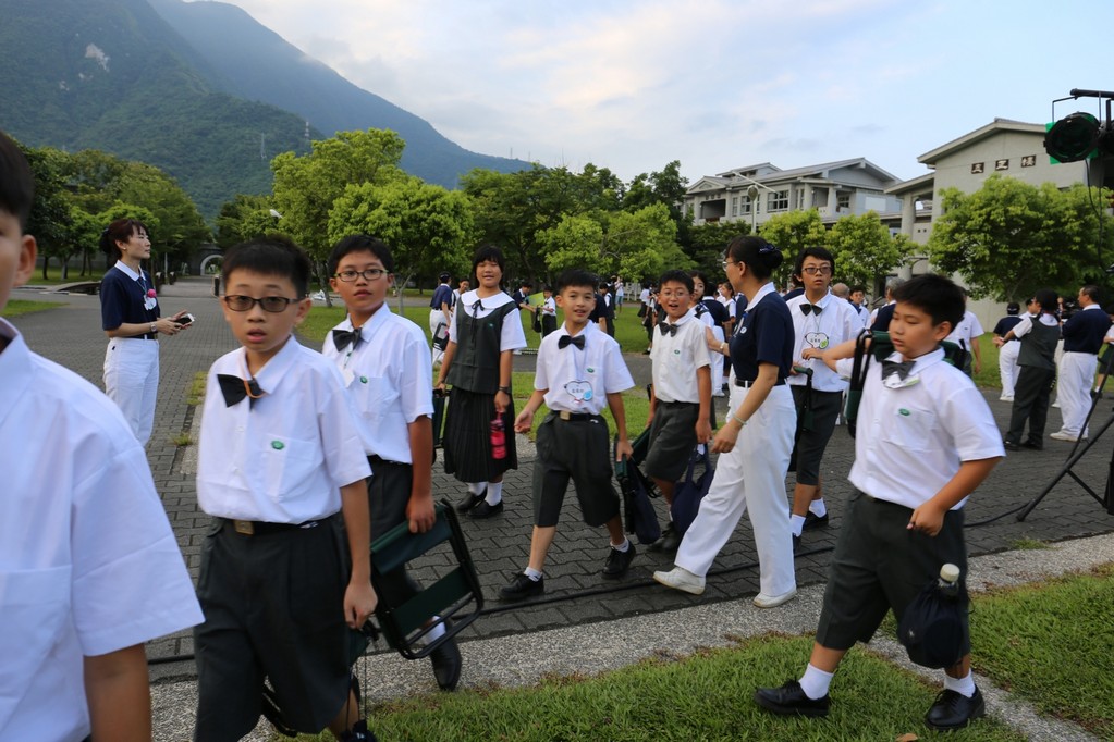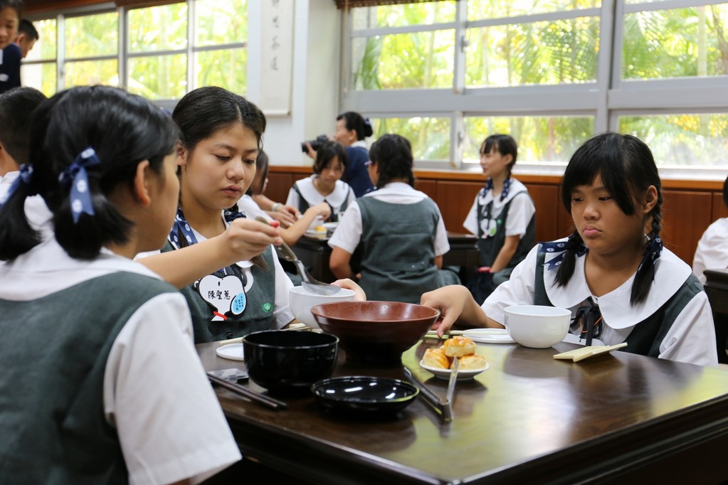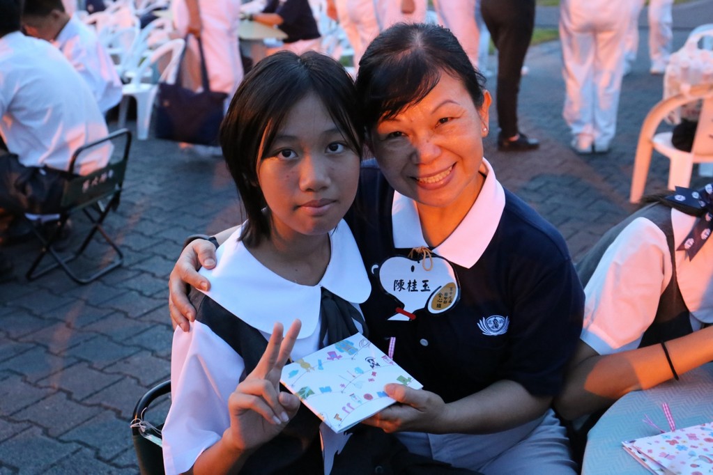 在傍晚時分迎新晚會由國一搖呼拉圈及高一跳繩中進場入座,在學長姊及懿德爸爸媽媽準備了手語演繹中展開晚宴的序曲。懿德媽媽爸爸將早上合心班合影的團體照手工卡片分送給每位同學,妙膳廳則準備了豐盛的晚餐及深具人文的擺盤讓同學們食指大動,薯餅和美味的菜餚很快的就一掃而空,同學在歡笑中讓留下美好的記憶。