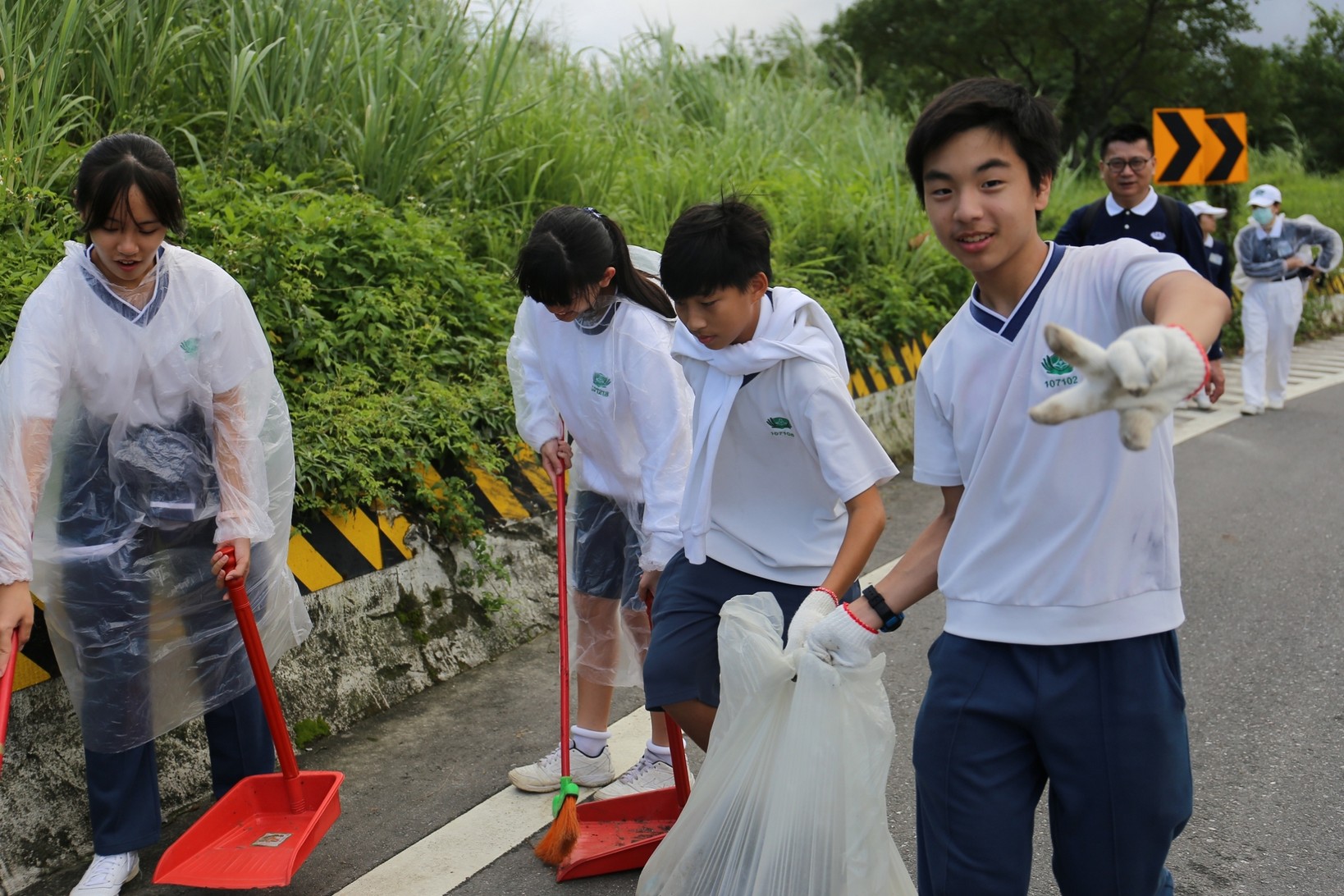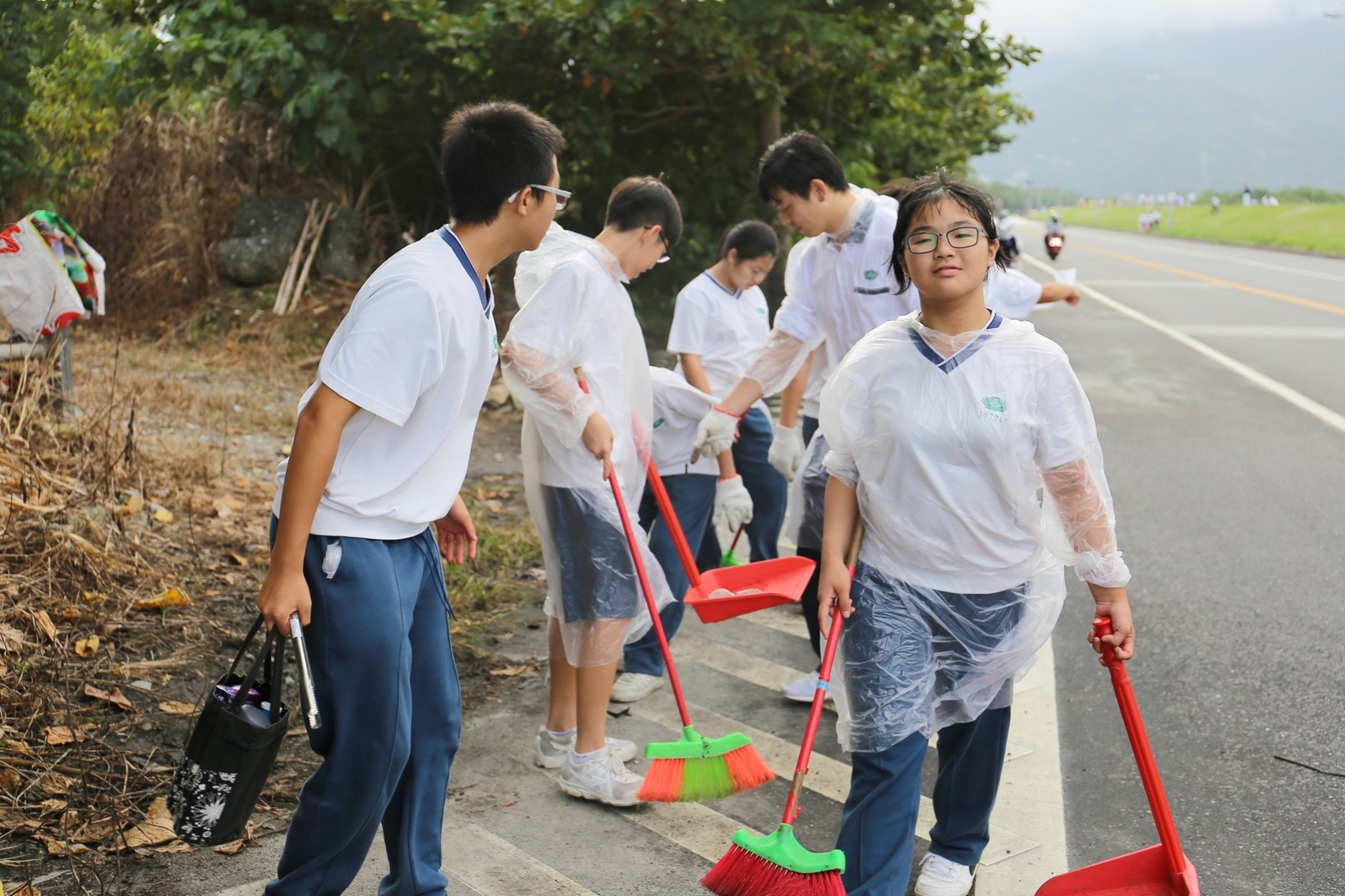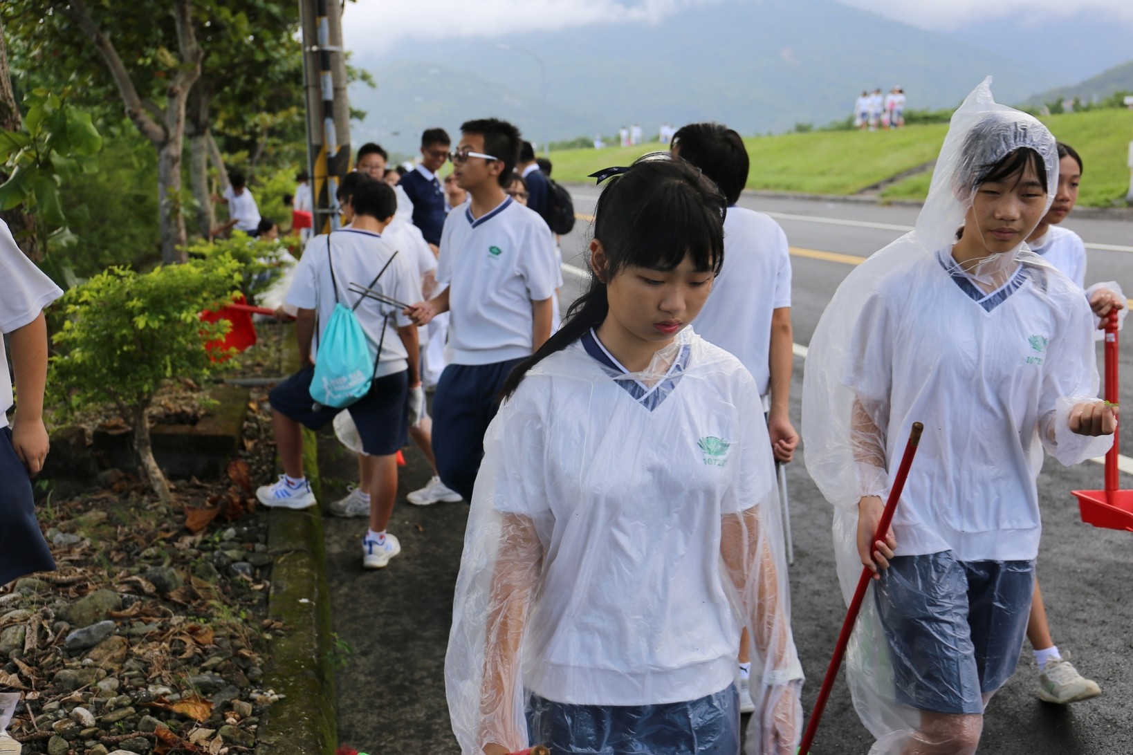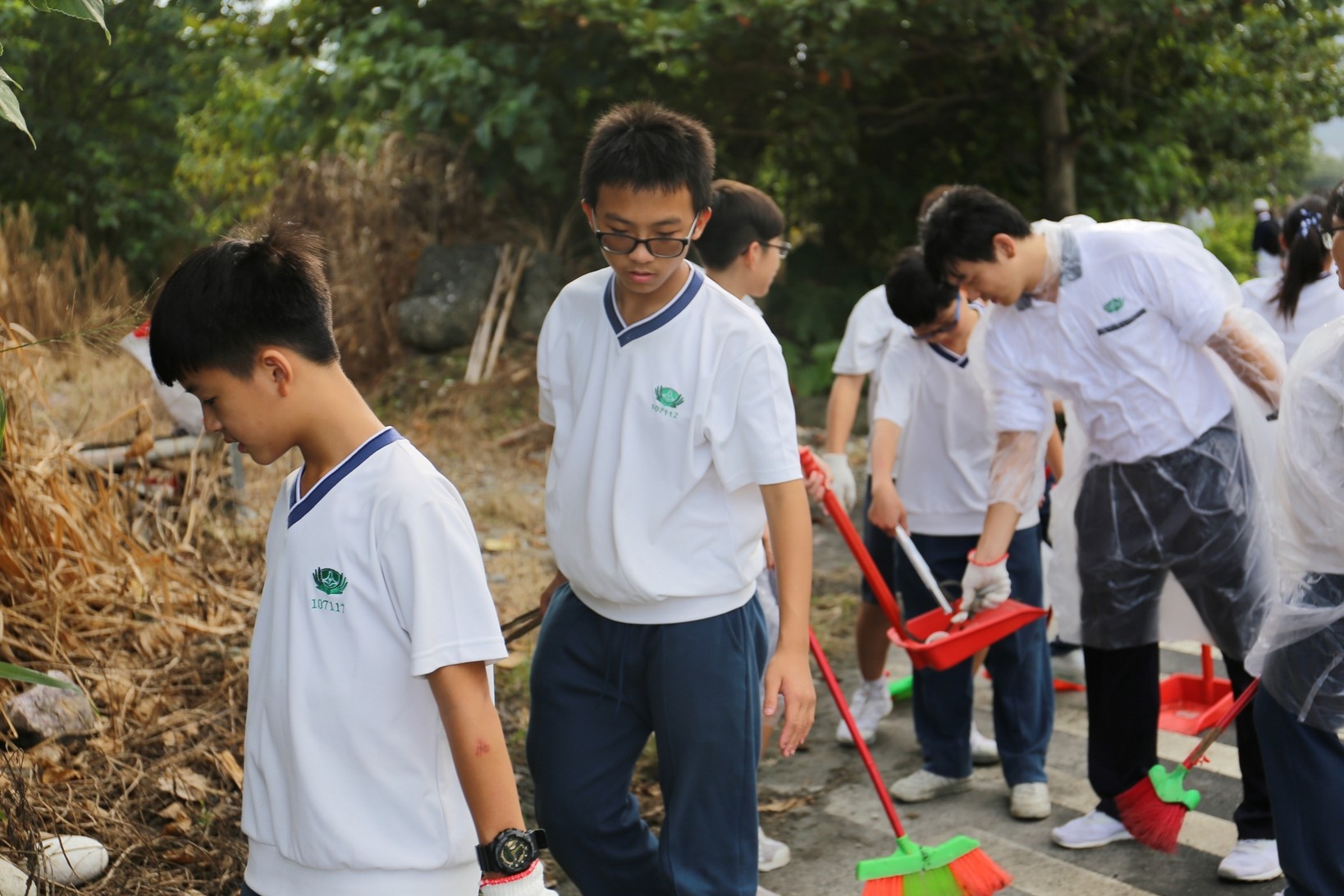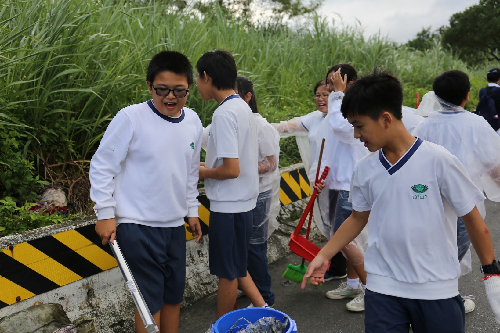 2018年十一月九日在慈中十九周年校慶的前夕,國一合心班的孩子們在家聚之後,戴起了手套,拿起了掃把、畚箕、夾子清掃工具,雖然剛開始天空下著毛毛雨,但在大為老師、昆霖老師及懿德爸爸媽媽帶領下,大家仍然一起走出校門沿著濟慈路撿拾路邊的垃圾。這一帶雖然沒有什麼住家,但是因為車道路邊仍然會有些路人隨手丟棄的垃圾,部份垃圾甚至在茂盛的草叢中,但是都被孩子們一一拾起集中由垃圾車收走。藉由這樣的活動讓孩子們瞭解利益人群可以由隨時隨地一念善心起。不是只打掃校內的清潔,也照護校園四周的環境,更進而傳遞淨化人們的心靈的訊息。