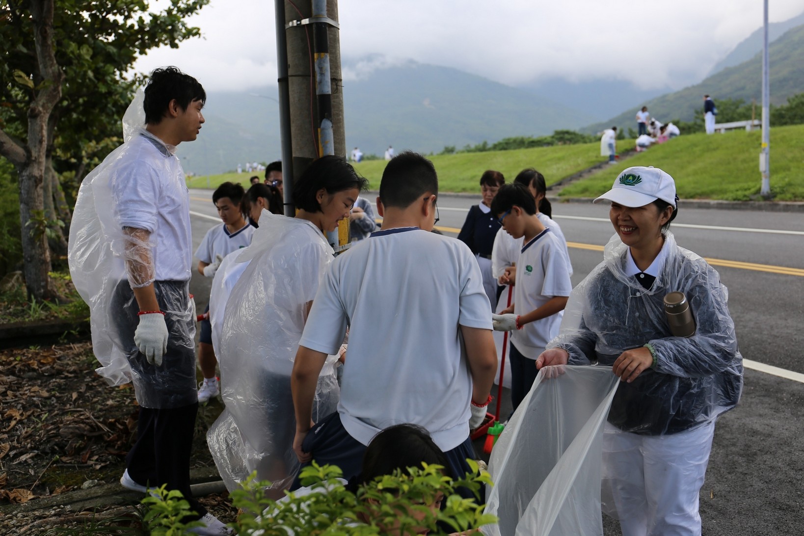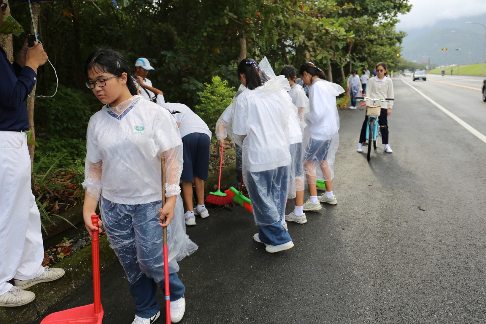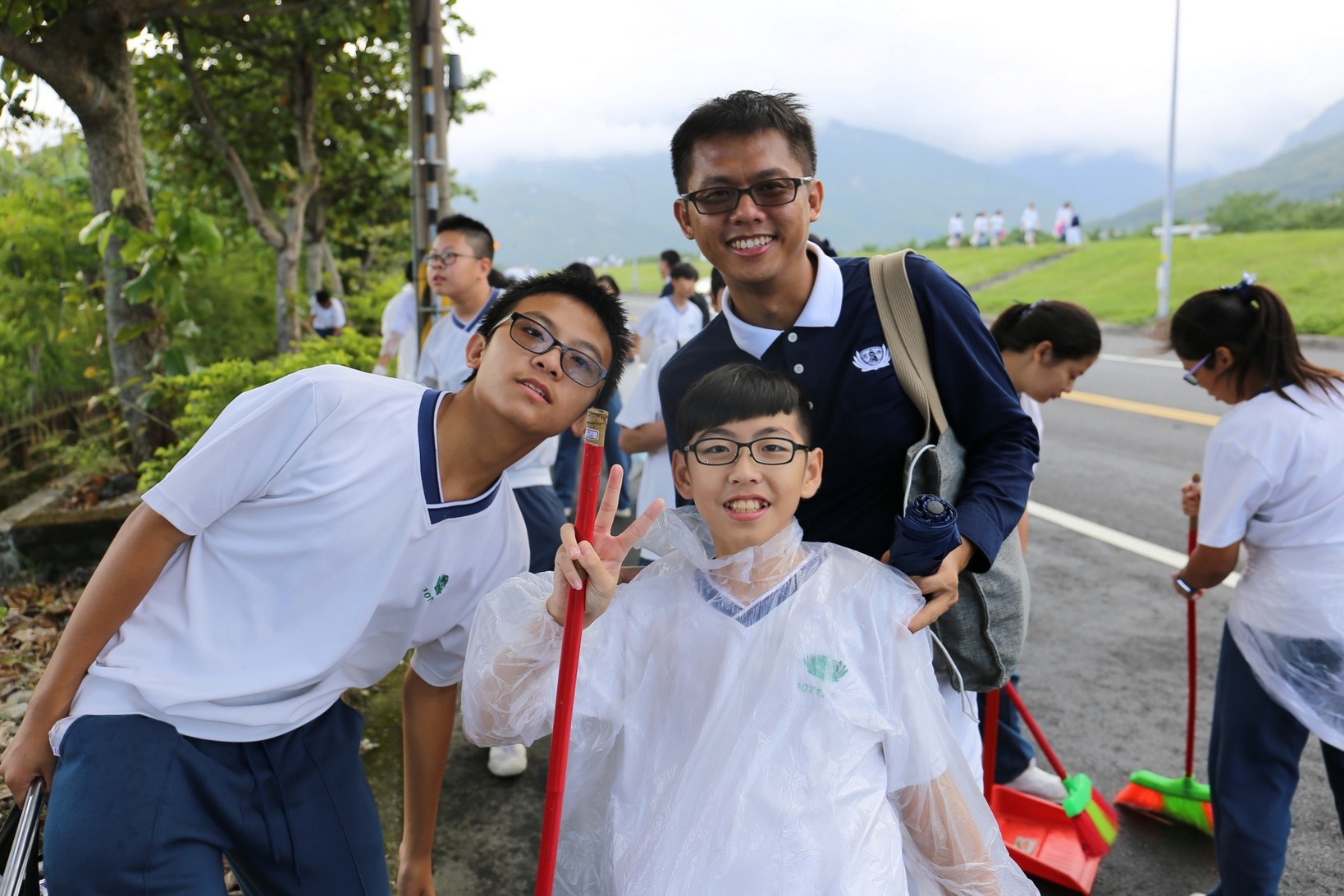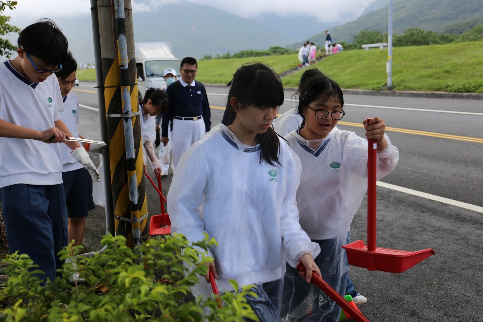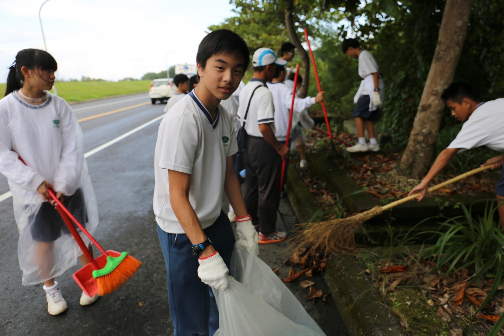 2018年十一月九日在慈中十九周年校慶的前夕,國一合心班的孩子們在家聚之後,戴起了手套,拿起了掃把、畚箕、夾子清掃工具,雖然剛開始天空下著毛毛雨,但在大為老師、昆霖老師及懿德爸爸媽媽帶領下,大家仍然一起走出校門沿著濟慈路撿拾路邊的垃圾。這一帶雖然沒有什麼住家,但是因為車道路邊仍然會有些路人隨手丟棄的垃圾,部份垃圾甚至在茂盛的草叢中,但是都被孩子們一一拾起集中由垃圾車收走。藉由這樣的活動讓孩子們瞭解利益人群可以由隨時隨地一念善心起。不是只打掃校內的清潔,也照護校園四周的環境,更進而傳遞淨化人們的心靈的訊息。