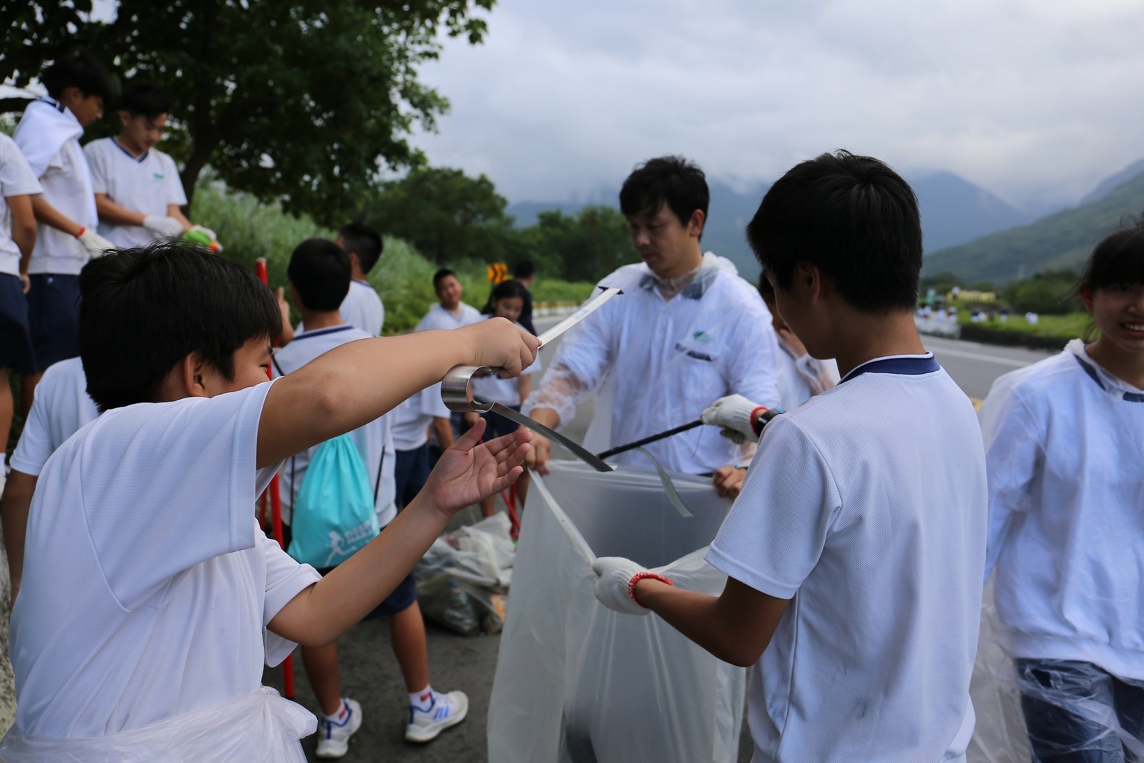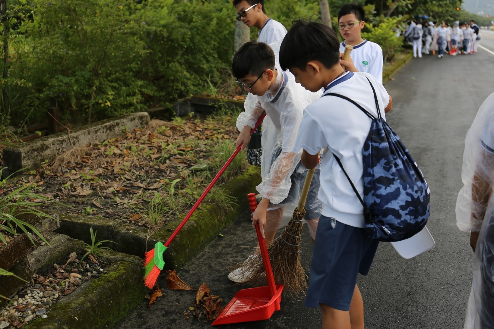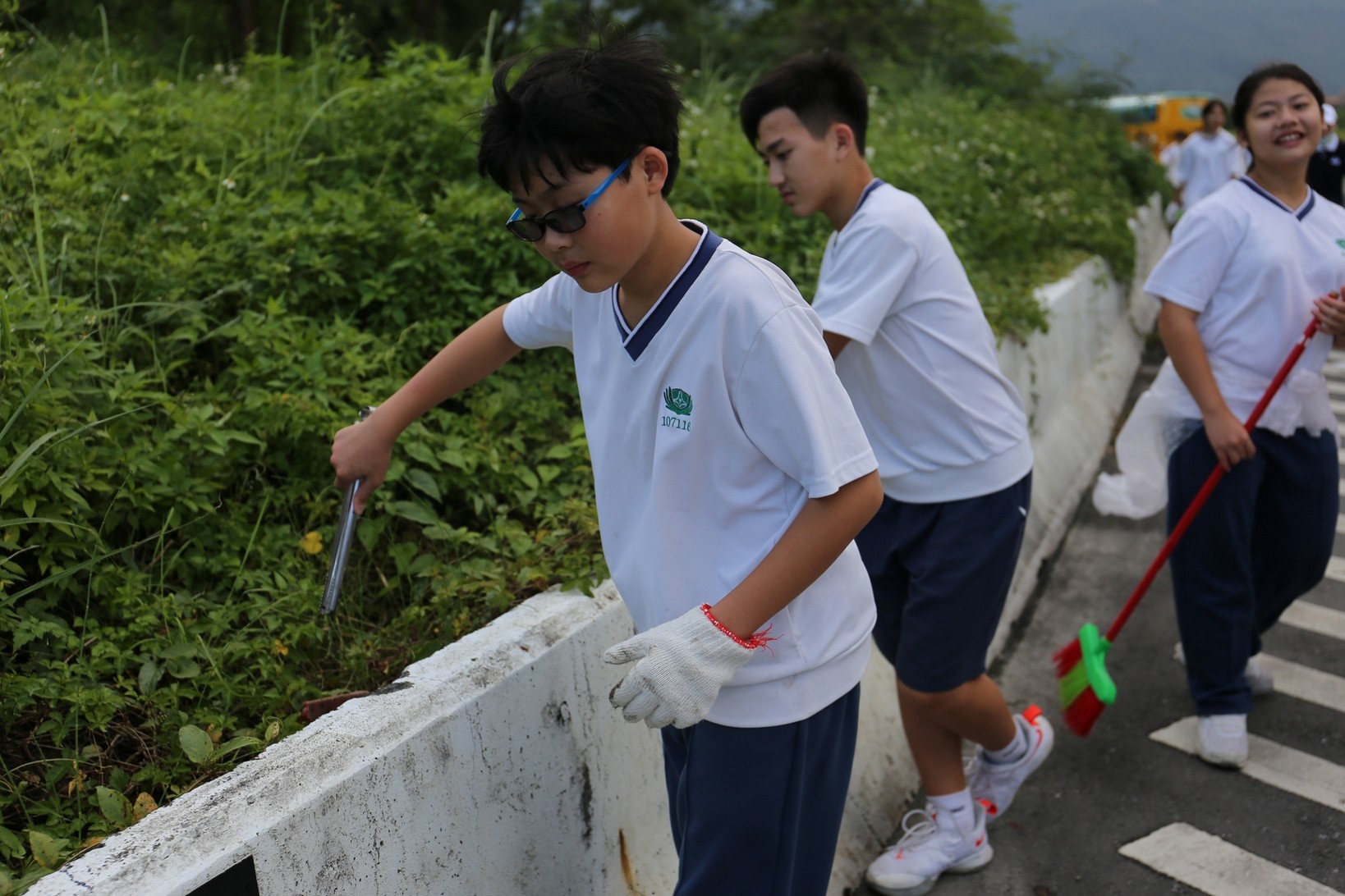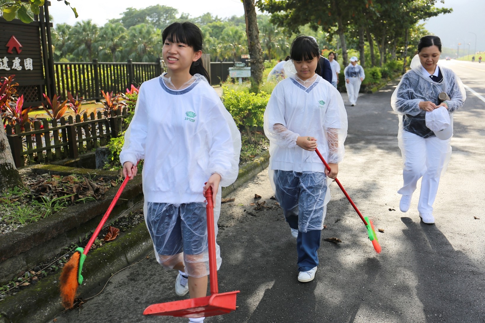 2018年十一月九日在慈中十九周年校慶的前夕,國一合心班的孩子們在家聚之後,戴起了手套,拿起了掃把、畚箕、夾子清掃工具,雖然剛開始天空下著毛毛雨,但在大為老師、昆霖老師及懿德爸爸媽媽帶領下,大家仍然一起走出校門沿著濟慈路撿拾路邊的垃圾。這一帶雖然沒有什麼住家,但是因為車道路邊仍然會有些路人隨手丟棄的垃圾,部份垃圾甚至在茂盛的草叢中,但是都被孩子們一一拾起集中由垃圾車收走。藉由這樣的活動讓孩子們瞭解利益人群可以由隨時隨地一念善心起。不是只打掃校內的清潔,也照護校園四周的環境,更進而傳遞淨化人們的心靈的訊息。