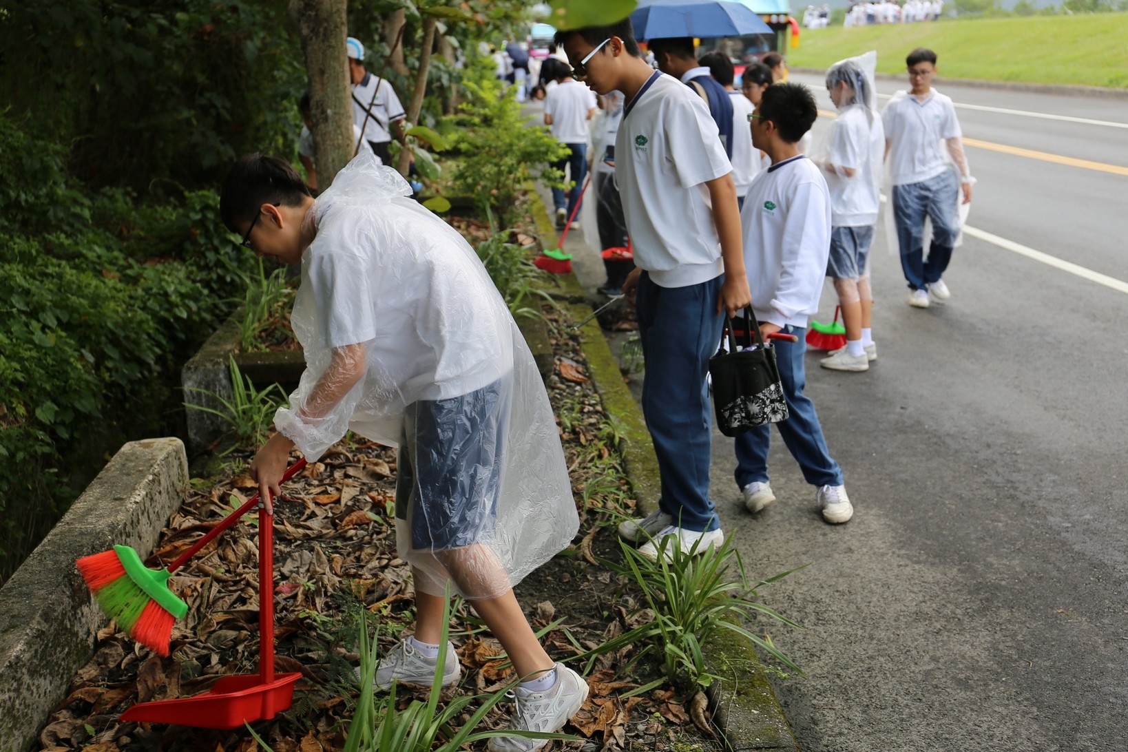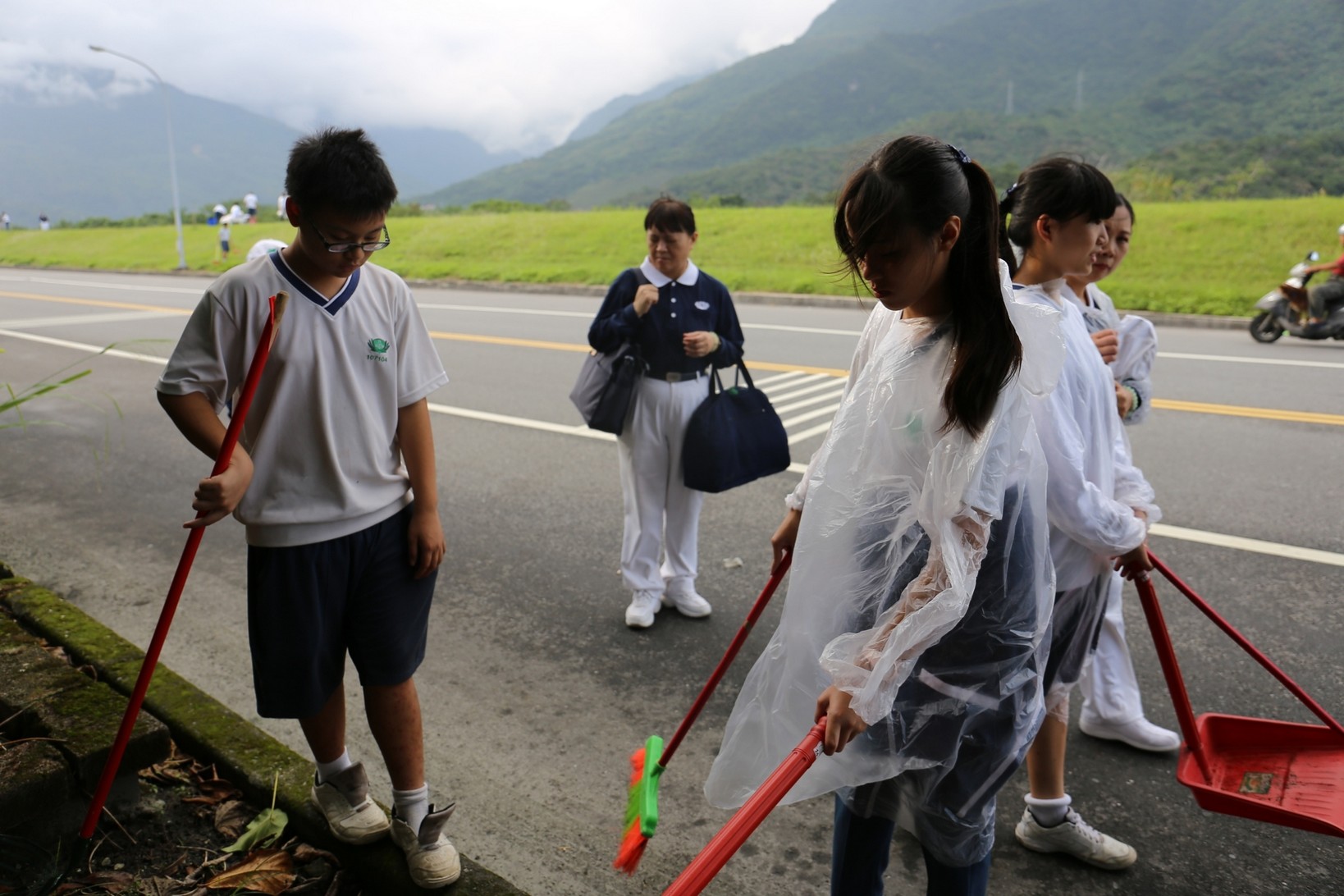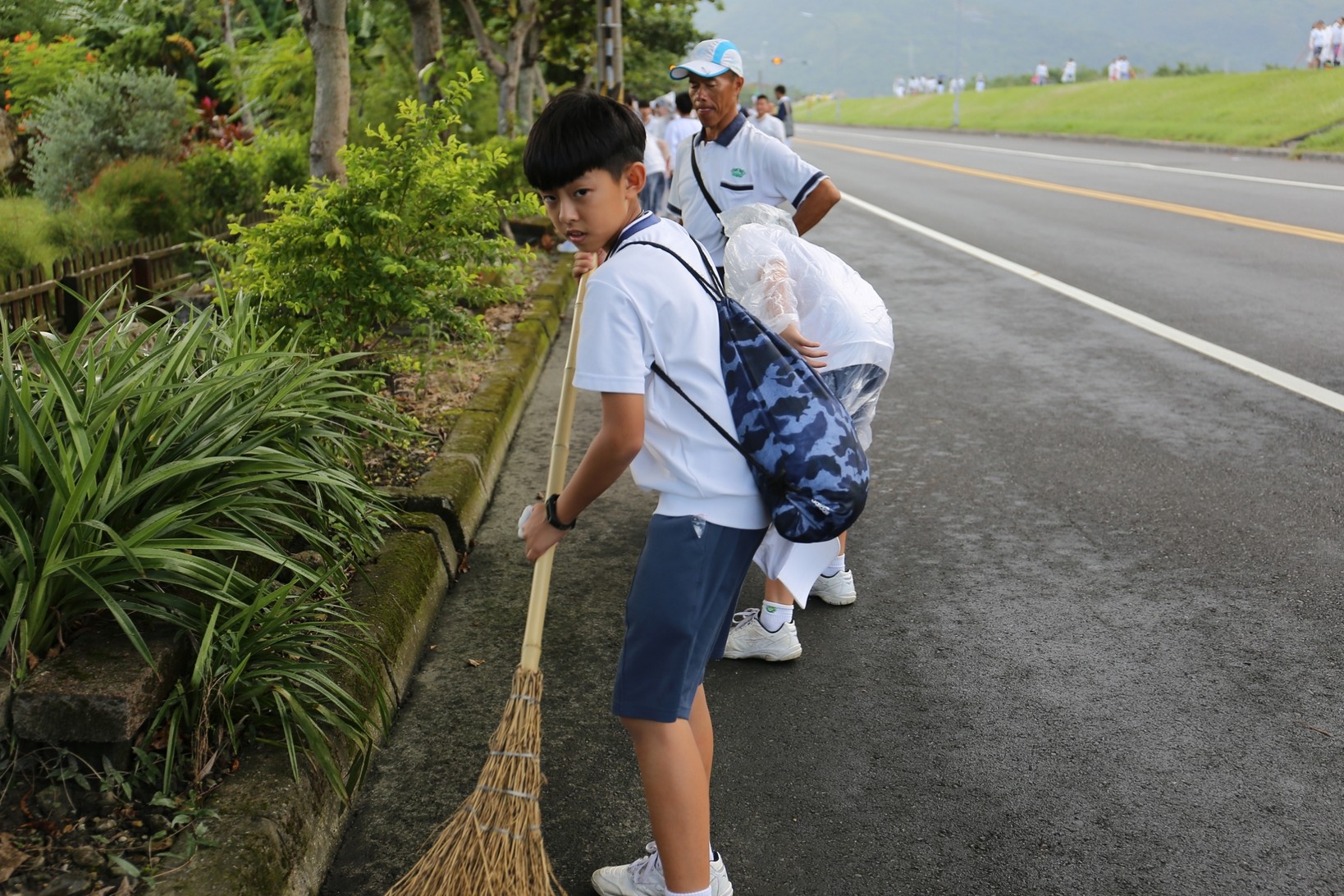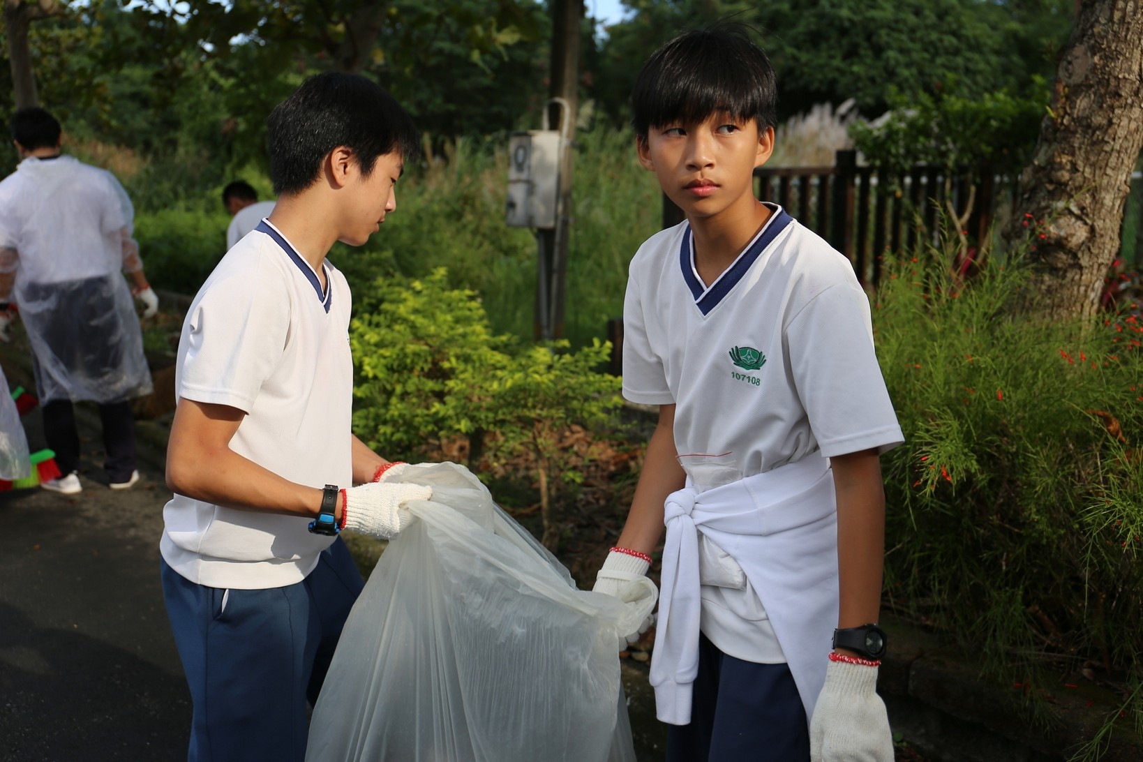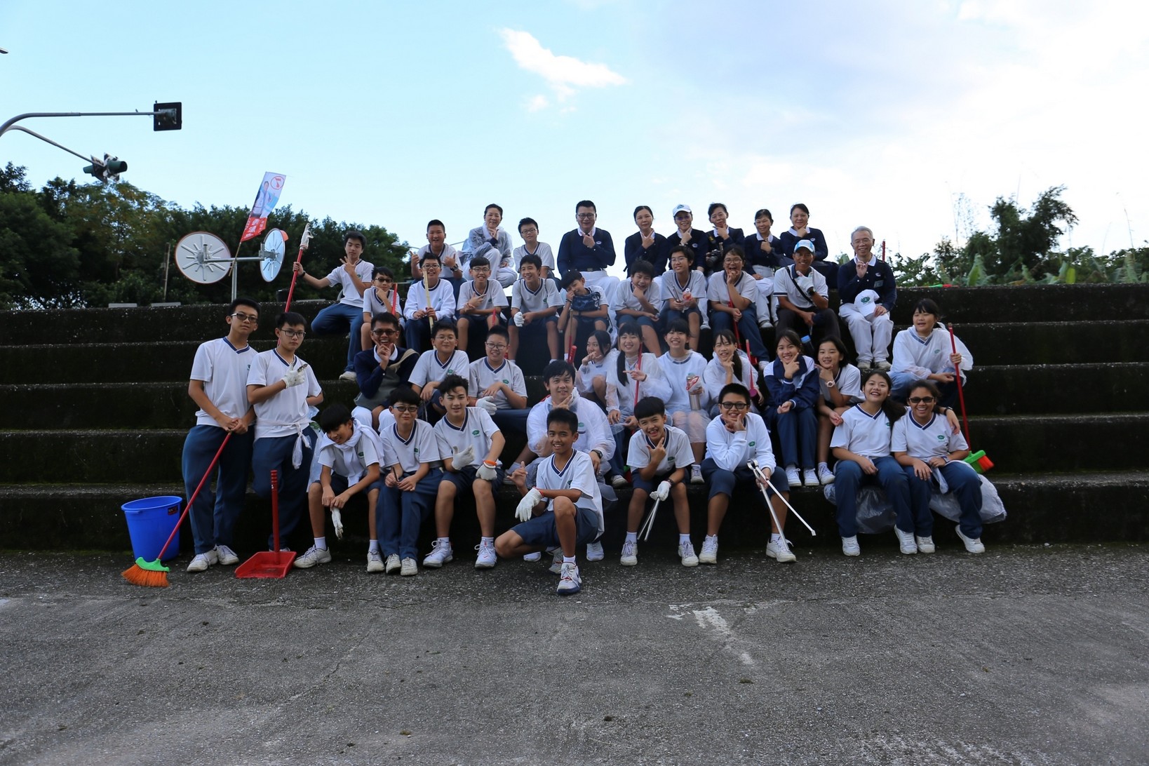 2018年十一月九日在慈中十九周年校慶的前夕,國一合心班的孩子們在家聚之後,戴起了手套,拿起了掃把、畚箕、夾子清掃工具,雖然剛開始天空下著毛毛雨,但在大為老師、昆霖老師及懿德爸爸媽媽帶領下,大家仍然一起走出校門沿著濟慈路撿拾路邊的垃圾。這一帶雖然沒有什麼住家,但是因為車道路邊仍然會有些路人隨手丟棄的垃圾,部份垃圾甚至在茂盛的草叢中,但是都被孩子們一一拾起集中由垃圾車收走。藉由這樣的活動讓孩子們瞭解利益人群可以由隨時隨地一念善心起。不是只打掃校內的清潔,也照護校園四周的環境,更進而傳遞淨化人們的心靈的訊息。