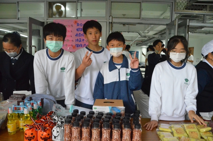 義賣會上第六攤桌上擺放著南部嚴選滷豆干、好事花生、彈珠汽水、核桃糕和咖啡包,都是懿德爸媽們為此次義賣準備的,貼心的孩子們一起到攤位幫忙,無疑是義賣會上最美的風景。