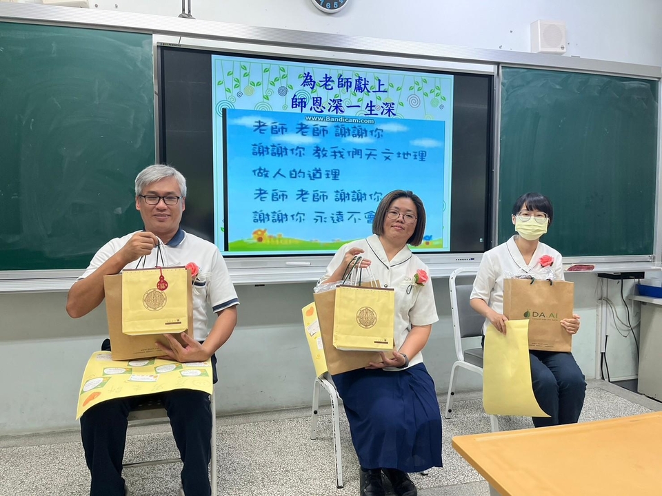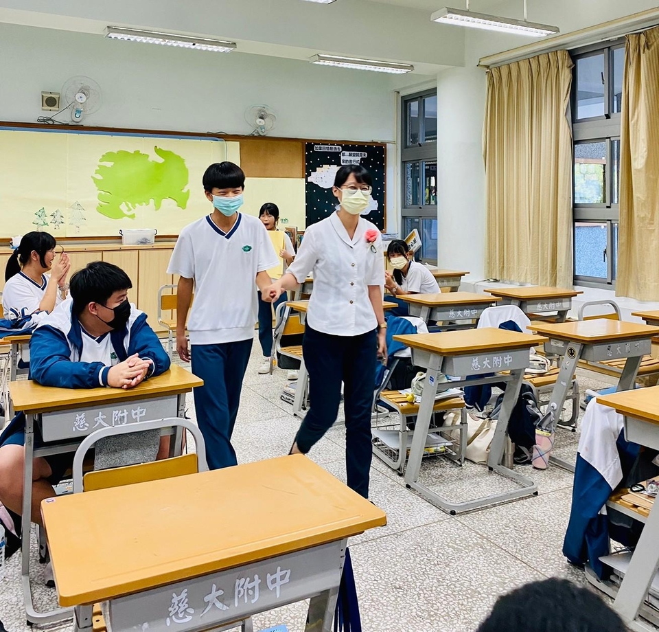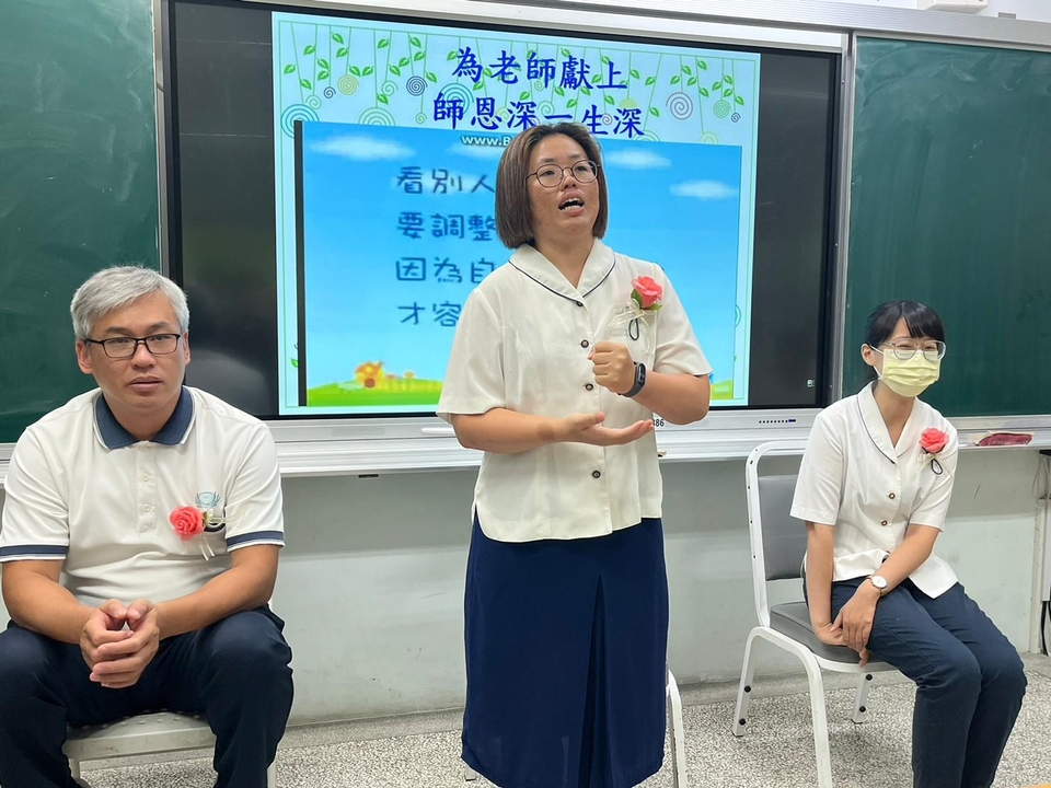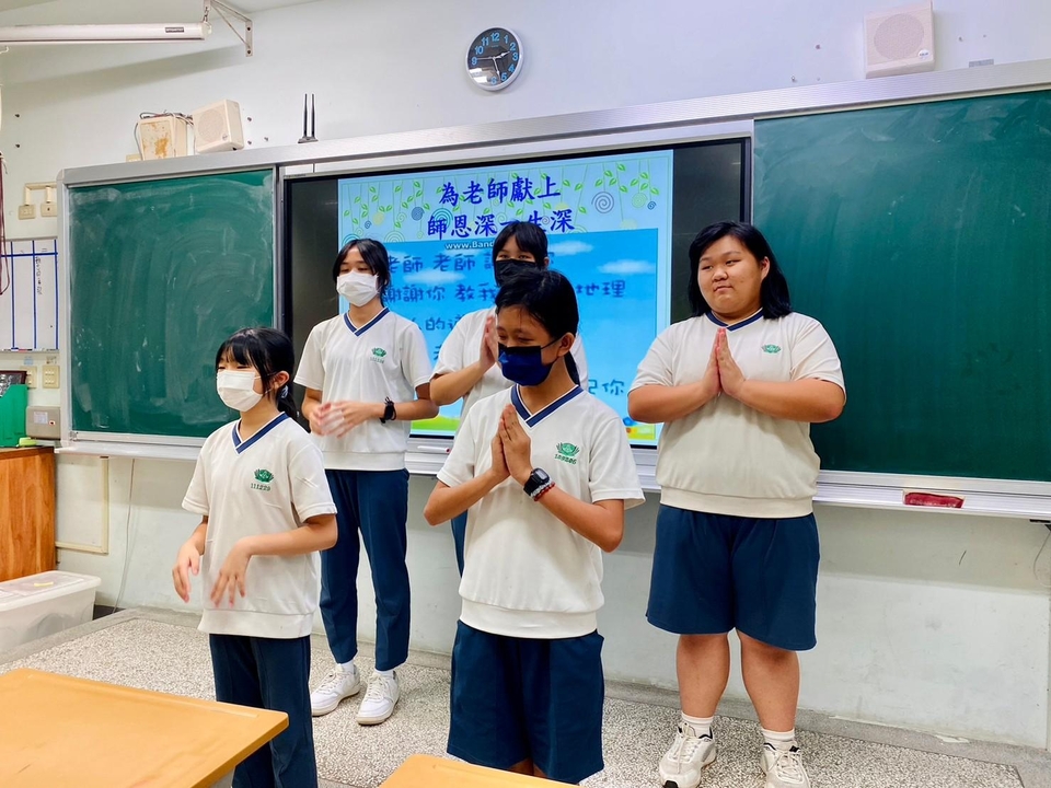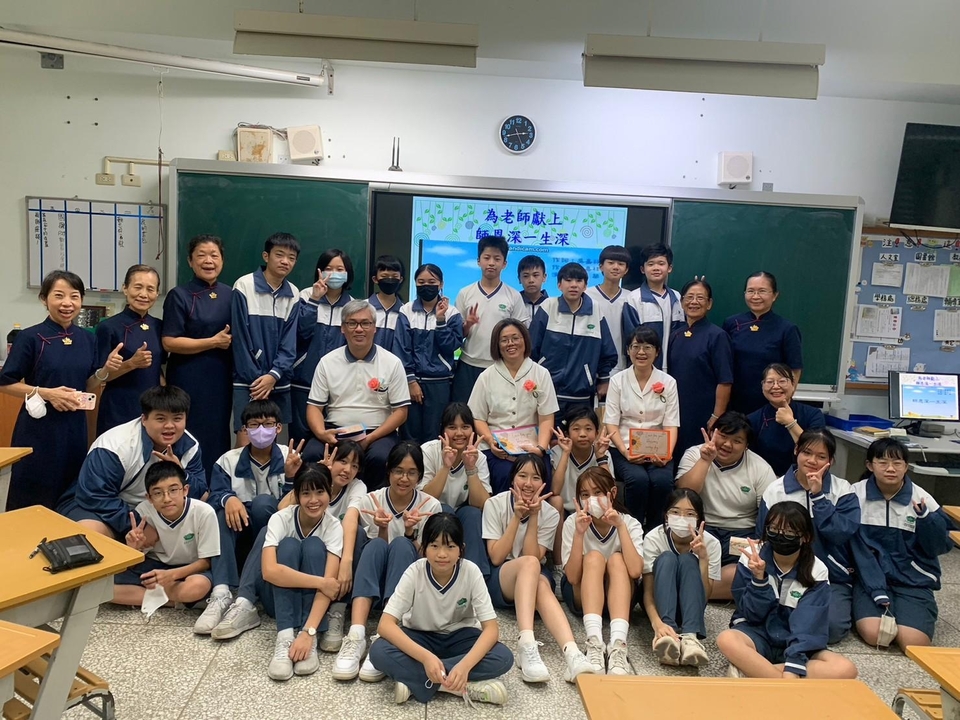 隨後就是大家最期待的教師節敬師活動,由班長和幹部們分頭邀約導師枋諴老師、數學課的彥男主任、英文課的譯云老師進班,端棗、素月和金諦媽媽幫老師們別上慈懿會特別準備的胸花後入座,欣賞班上手語小天使們,上台為老師帶來的〈師恩深一生深〉。