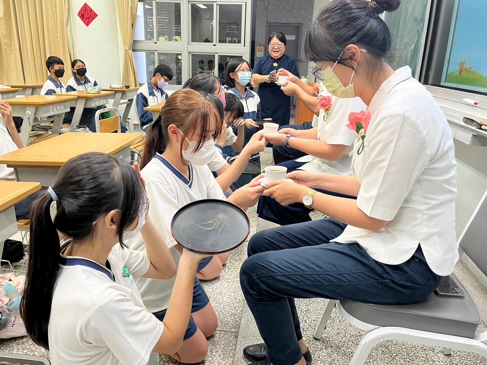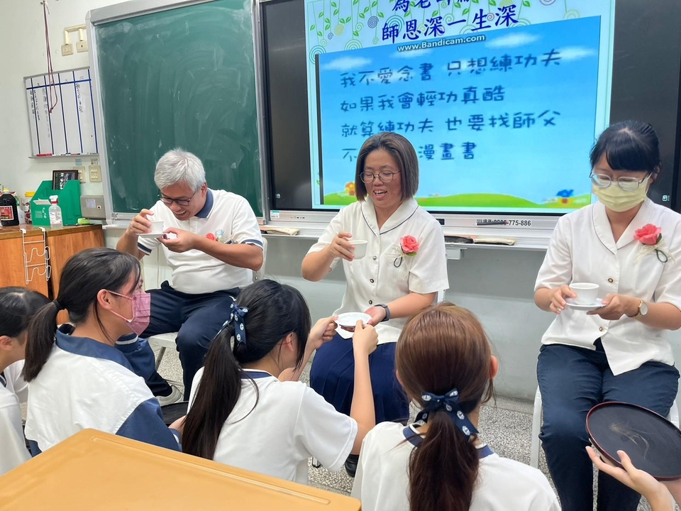 在全班齊聲合唱的歡樂氣氛後,由大森、凱亞、李蔚三位同學,恭敬引領三位老師,走過星光大道,上台坐上貴賓座,在隱形的紅毯上,彥男主任逗趣的慢動作前進,逗得全班掌聲笑聲不斷,待三位老師都坐上貴賓座,由班長筠喬帶著幹部姵岑、子平、珞妘、妤歆、京蔚一起端茶,並恭敬的為老師奉茶,感恩師恩,奉茶儀式在全班一同感恩老師的感動中,三位老師輪流說出國二合心班成長與蛻變的喜悅,導師枋諴老師更是與25位班上同學約定,一位都不能少,大家要一起畢業,也期許孩子能夠越來越棒!!