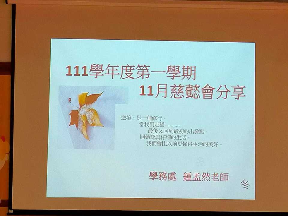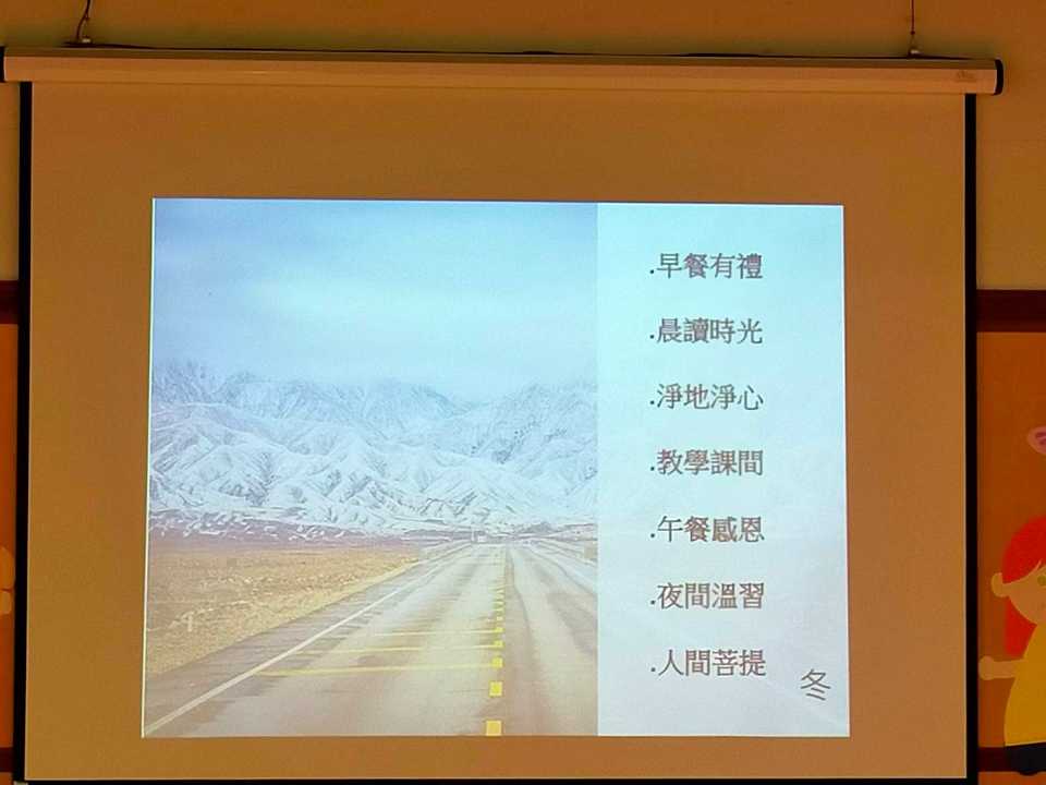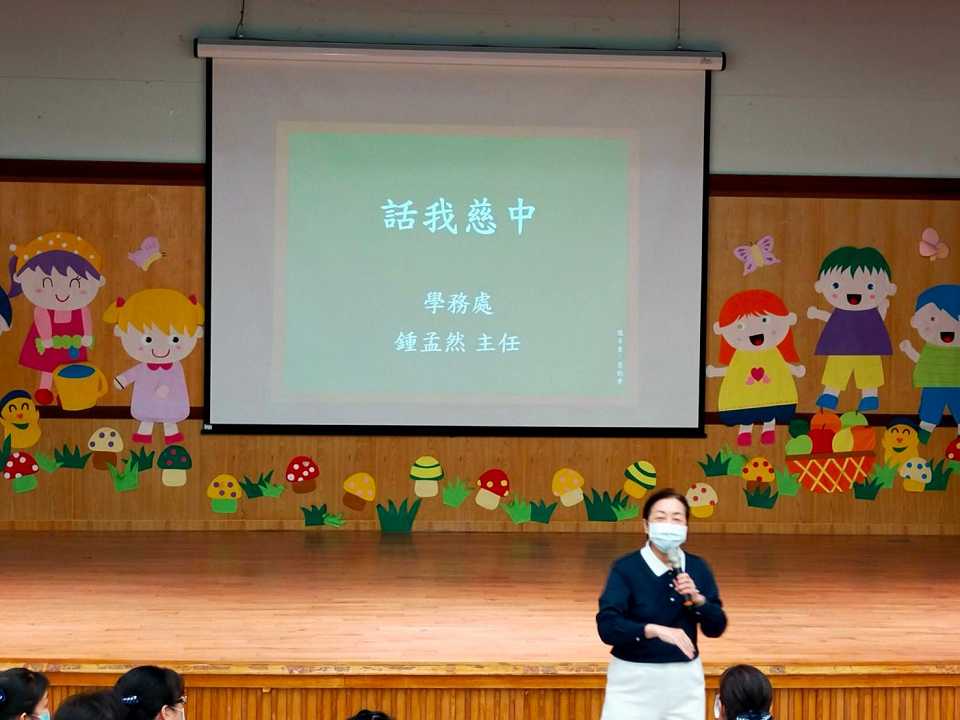 ※「話我慈中」邀請到學務組的孟然主任來分享,看似嚴肅不苟言笑的主任,話匣子一開幽默風趣,滿室生輝。主任特別提到在校園裡看到最美的一道風景就是慈懿爸媽隊伍浩蕩長,讓他心生感動,萌念要訓練國一新生也能擁有這股慈濟人獨有的人文素養。主任從住宿生的早餐儀軌開始進行培訓,從打理服裝儀容、6:40集合整隊、行進齋堂、用餐前唱感恩歌等開始教起,一直到結齋後環境的清潔,桌椅復歸原位,主任靜靜地看著學生們做,並拍照留下足跡與爸媽們分享,從照片中看到這些孩子們純稚的臉龐,認真用心的表情,沒有人嬉笑打鬧,個個舉止從容得體。事後主任也覺得孩子們的表現比預期的好,讓他信心倍增相信孩子是可教的。主任還提到每晚陪伴學生觀賞人間菩提,觀畢分享是師生互動很好的機會。總結:我們可以做轉變,但不要放棄機會,也不要因為沒有效果而不做。