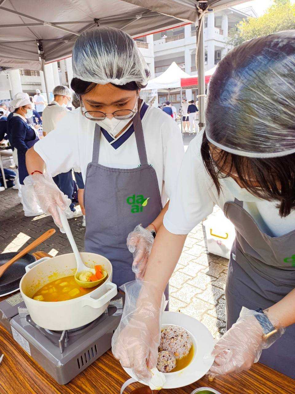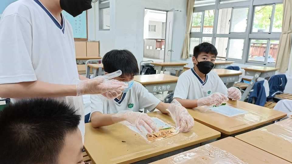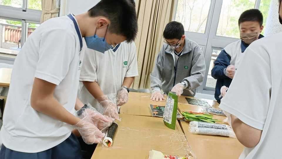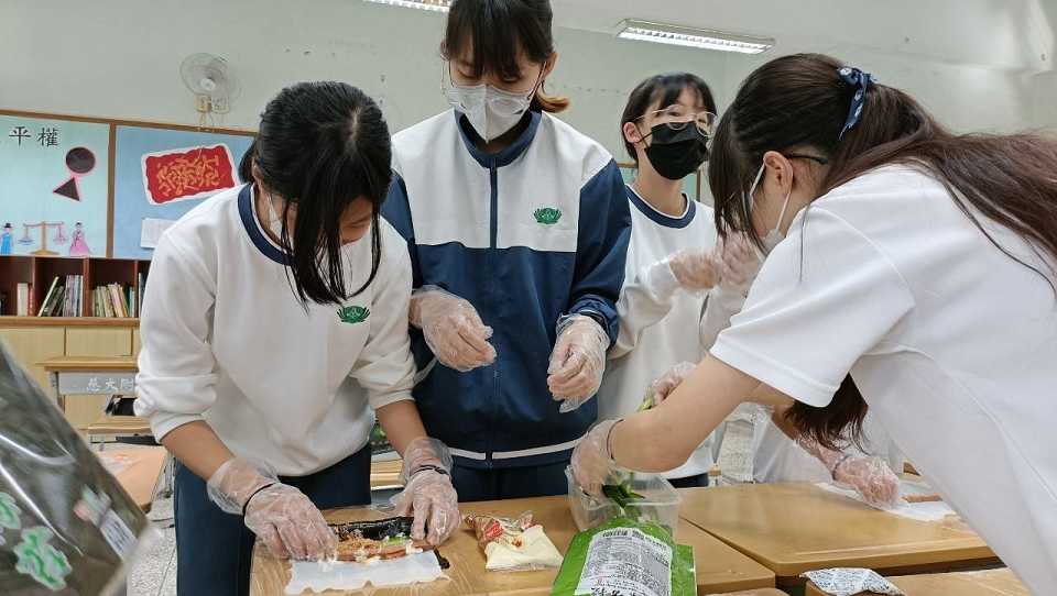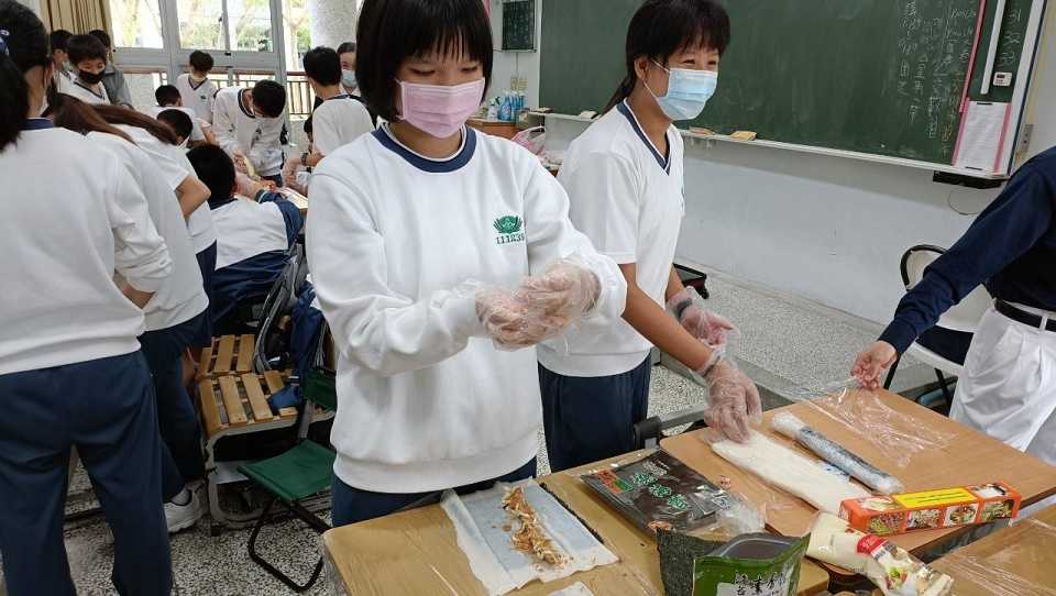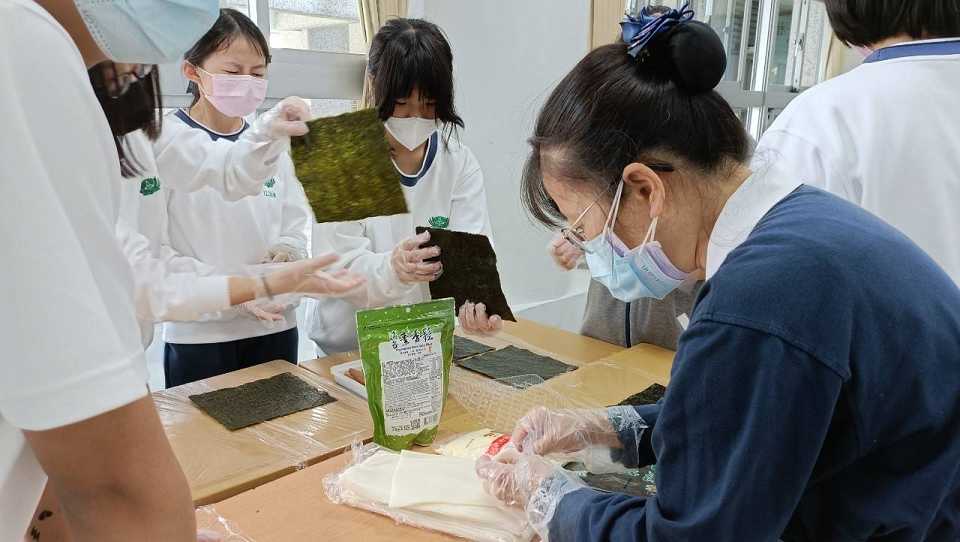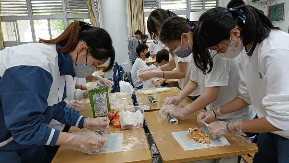 ※福田廣場的創意料理正如火如荼地展開著;各班教室裡也不遑多讓,沒有參賽的孩子們幫忙張羅準備義賣的品項。班上準備義賣的產品有現做河粉捲、素丁香、御飯糰等。