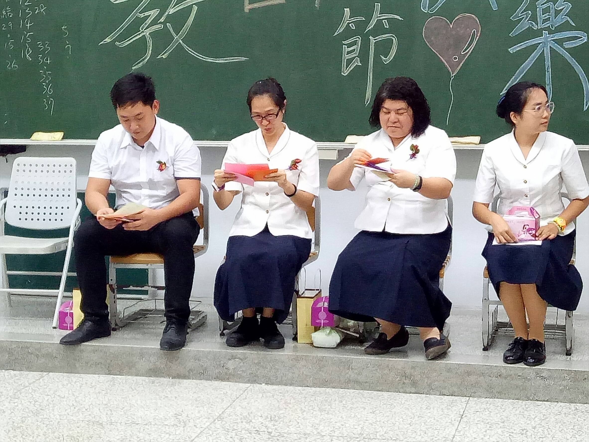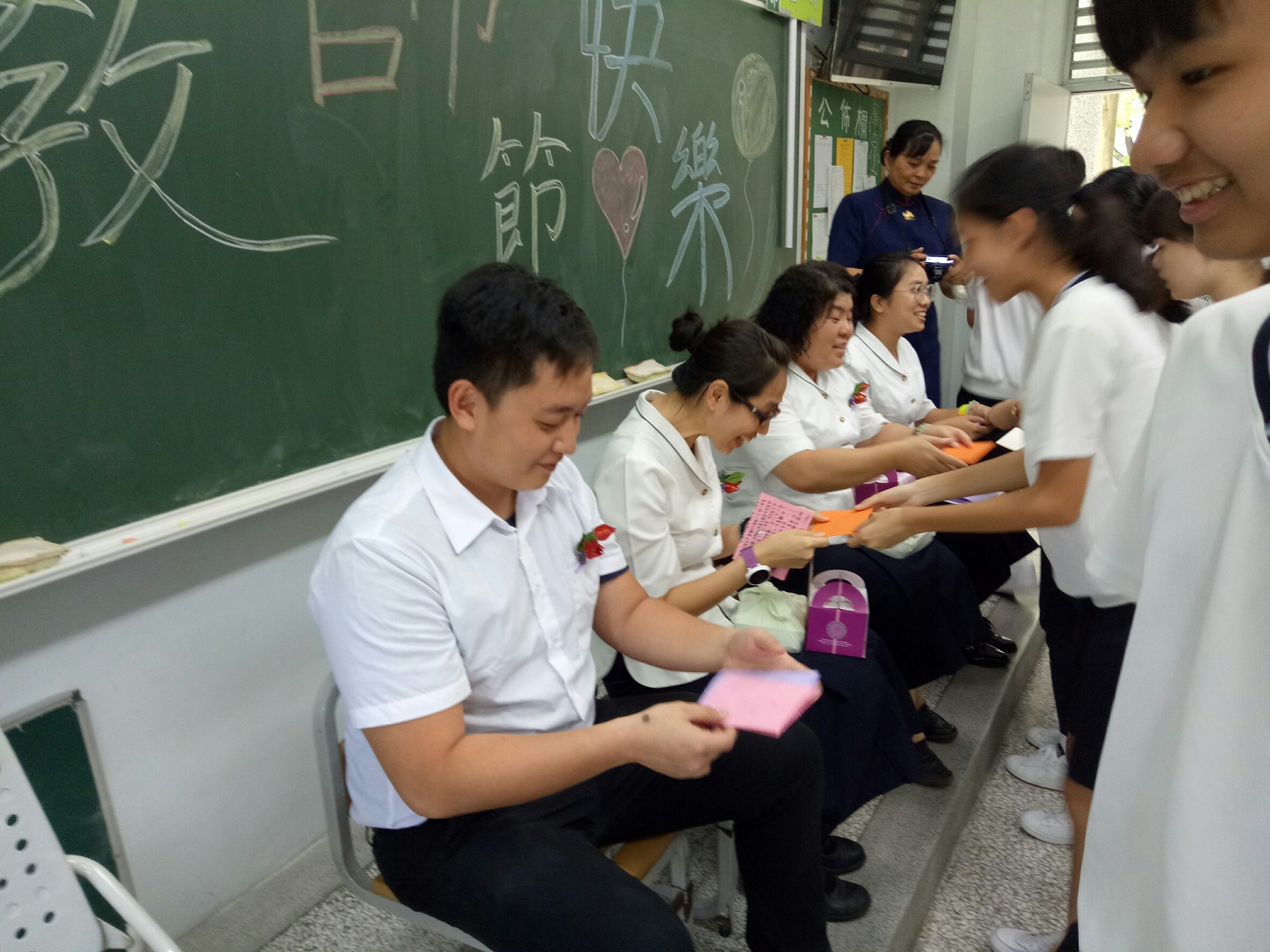 今天老師找了兩位孩子當司儀,雖然有點生疏,但勇氣可嘉。學生表演手語(感謝) ,奉茶、點心給自己的父母,相信父母親滿滿的感動與歡喜。