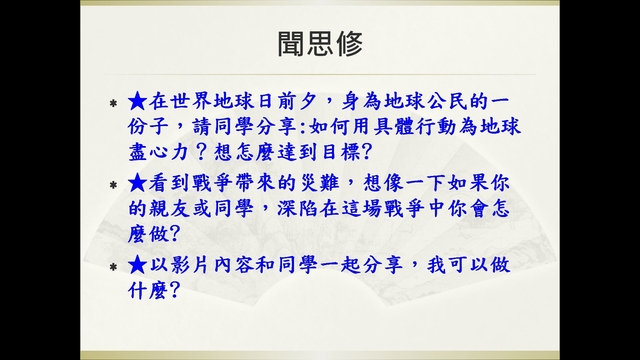 ◎藉著錦鈺老師推薦的〈戰影下的光-土耳其胡光中 滿納海 敘利亞阿里〉六分鐘短片,看到戰爭摧毀家園,使得敘利亞難民流離失所,孩子們只能淪為童工,無法上學的真實故事,希望孩子們能夠有所感受。