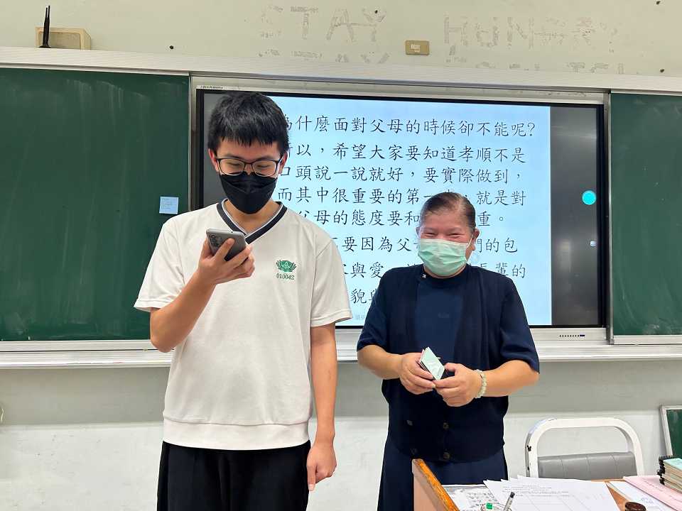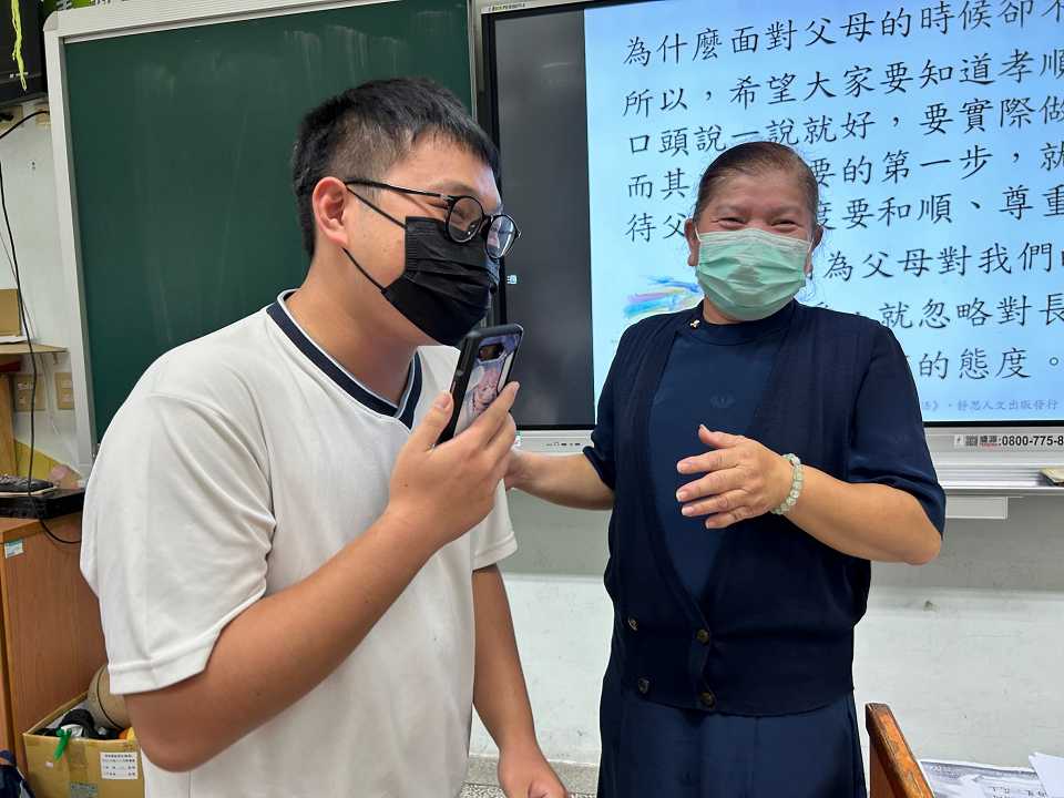◎下午的人文課程由玲華媽帶動,她以課務團隊提供的「感恩尊重愛」為主,先播放影片〈母親的名字〉,再輔以〈媽媽的畫像〉,引導孩子反思與父母和長輩的相處以及生活實踐,思考一直以來是否輕忽了父母對自己的愛,未曾好好感恩。她邀請本月壽星上前call out給家人,孩子勇敢說出「感謝你在這個月把我生下來,媽媽我愛你」、「阿嬤,我愛你,祝你身體健康」,卻因平常不曾如此做,電話那頭,有媽媽以為孩子是為了要零用錢或以為孩子生病了,以為是詐騙集團,見此一幕,臺下的同學爆出笑聲。玲華媽媽提醒孩子,「家人也曾年輕過,並不是生來就是孩子現在看到的樣子,他們正在變老,要常常打電話問候、趁來得及的時候,多陪伴和道愛、道感恩。」