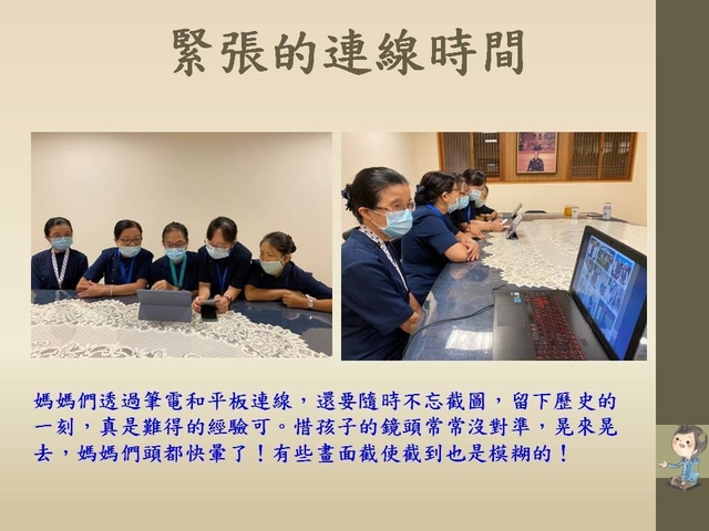 媽媽們透過筆電和平板連線,還要隨時不忘截圖,留下歷史的一刻,真是難得的經驗可。惜孩子的鏡頭常常沒對準,晃來晃去,媽媽們頭都快暈了!有些畫面截使截到也是模糊的!