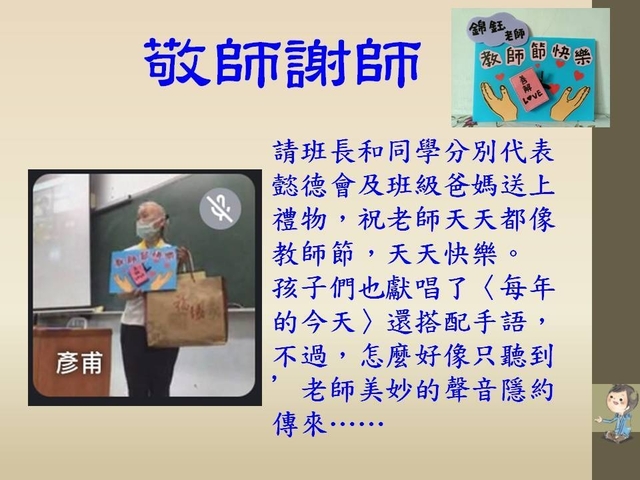 然後就要邀請若岑媽媽來跟代表獻上教師節的祝福 。