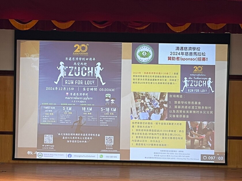 為了援建帕傣村,在清邁慈濟學校發起慈善馬拉松,訊息輾轉讓若岑師姊知曉,隨即在慈懿會發起贊助,藉著這次回台的因緣,予慈懿會的爸爸媽媽們道感恩,能讓遠在海外的清邁學校師生,也能感受到慈懿會的愛。