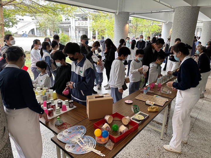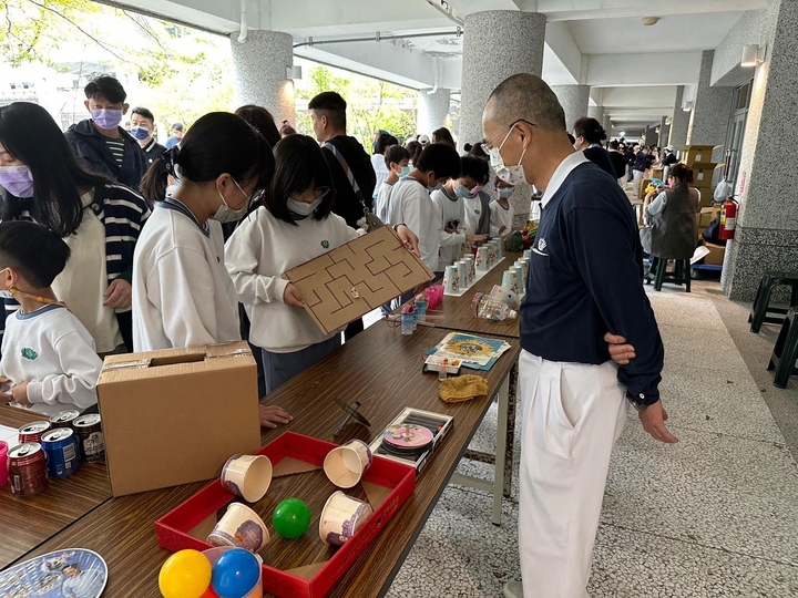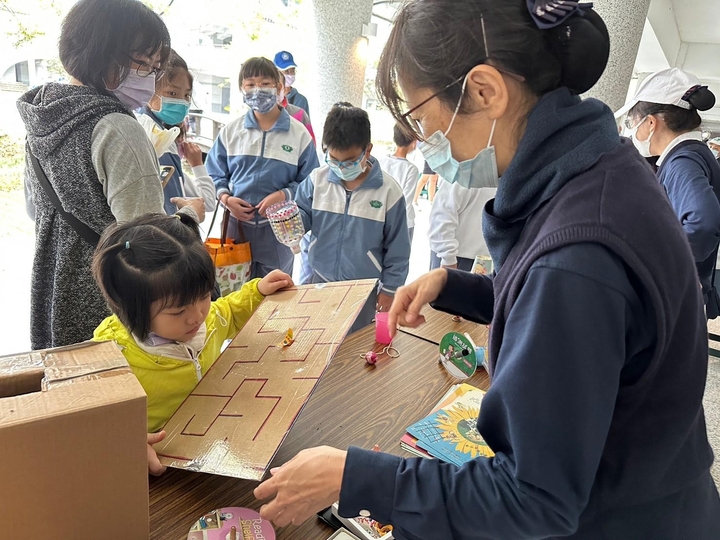 第二天一早便開始下雨,擔心校慶無法順利進行,果真,我們雖然虔誠祈禱,但老天爺還是不賞臉,持續下著雨,所以運動會取消了,但是義賣園遊會仍在雨天備案的地下通道熱烈展開,所以有人笑稱以後要做「晴天備案」才對!我們班今天顧環保攤位,照月媽準備了許多的遊戲,不僅是環保製作,還需要動腦,一開張就有多位父母帶著孩子來玩,一直詢問:這些教具有賣嗎?我們回答:可以拍照回家自己做。很可愛的家長們。只是智慧真的不好賣啊,即使有很多的小朋友來到攤位前,可是對小小孩,能投入十元是最大極限了,不過,看到孩子們玩得開心,就值回票價了。
