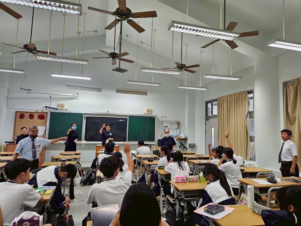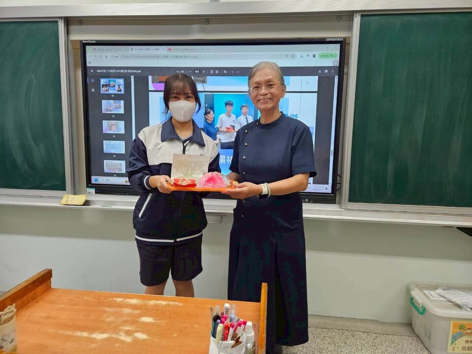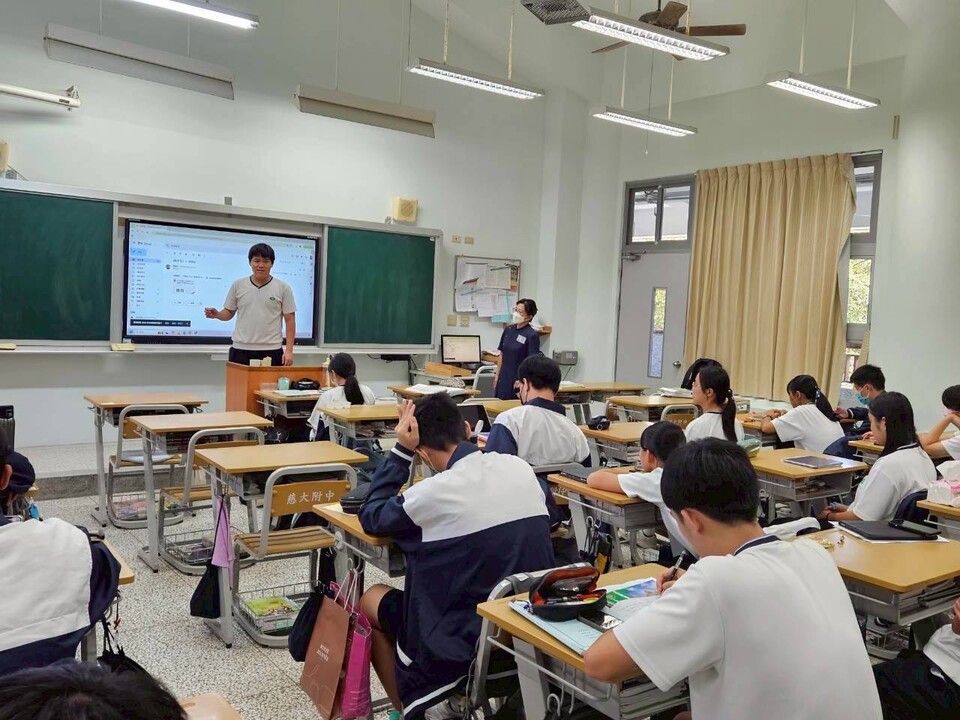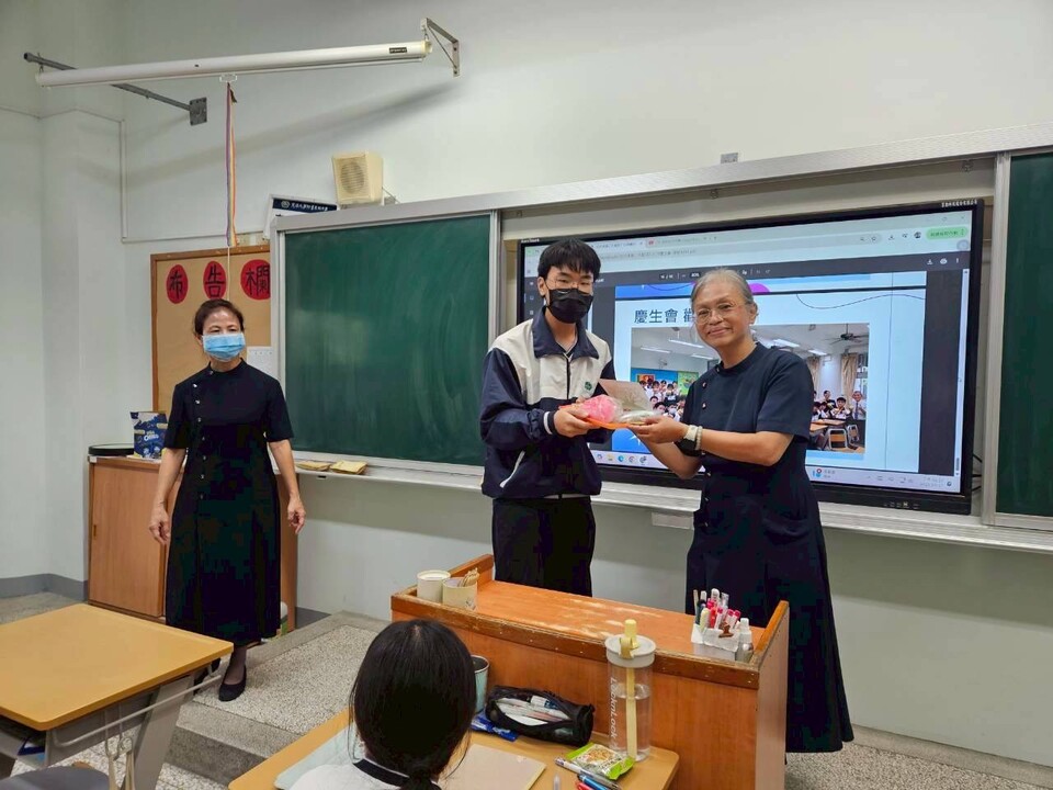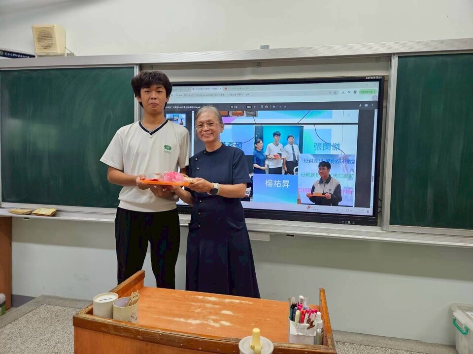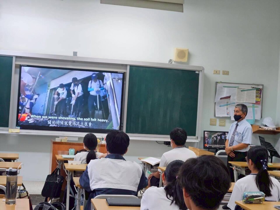 隨後,班上的同學也上台分享親身參與光復災區清掃的心得。緯詮同學說:「剛開始鏟泥很吃力,但漸漸就上手了。走進菜園時整隻腳陷入泥裡,拔了好久才拔出來!」他笑著回憶那份又累又溫暖的經驗:「雖然手酸腳痛,但在火車站吃到志工們準備的午餐,真的覺得很暖心。」